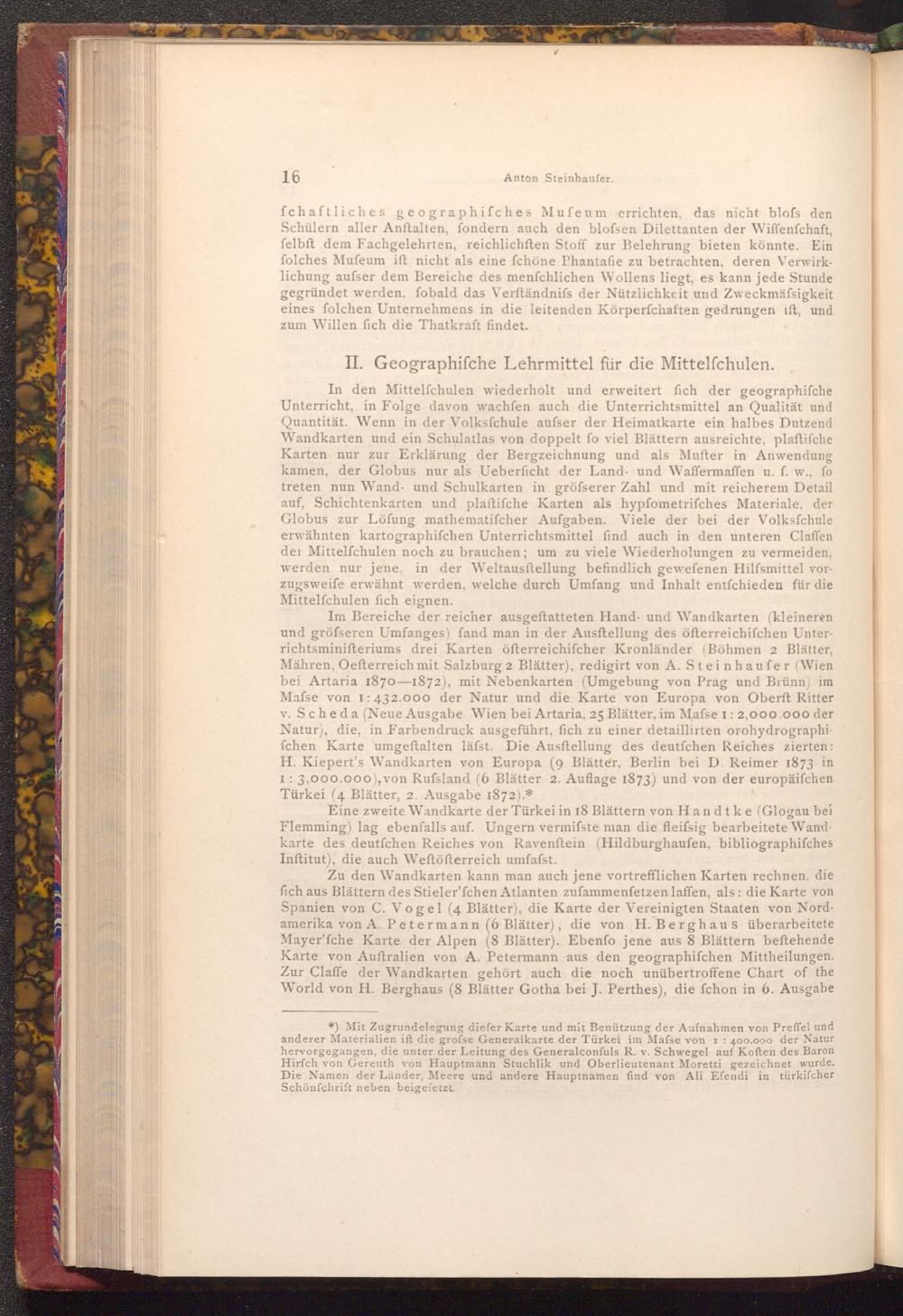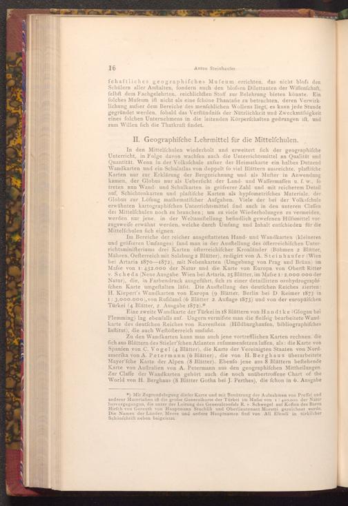 In den Mittelfchulen wiederholt und erweitert fich der geographifche Unterricht, in Folge davon wachfen auch die Unterrichtsmittel an Qualität und Quantität. Wenn in der Volksfchule aufser der Heimatkarte ein halbes Dutzend Wandkarten und ein Schulatlas von doppelt fo viel Blättern ausreichte, plaftifche Karten nur zur Erklärung der Bergzeichnung und als Mufter in Anwendung kamen, der Globus nur als Ueberficht der Land- und Waffermaffen u. f. w., fo treten nun Wand- und Schulkarten in gröfserer Zahl und mit reicherem Detail auf, Schichtenkarten und plaftifche Karten als hypfometrifches Materiale, der Globus zur Löfung mathematifcher Aufgaben. Viele der bei der Volksfchule erwähnten kartographifchen Unterrichtsmittel find auch in den unteren Claffen dei Mittelfchulen noch zu brauchen; um zu viele Wiederholungen zu vermeiden, werden nur jene, in der Weltausftellung befindlich gewefenen Hilfsmittel vorzugsweife erwähnt werden, welche durch Umfang und Inhalt entfchieden für die Mittelfchulen fich eignen.