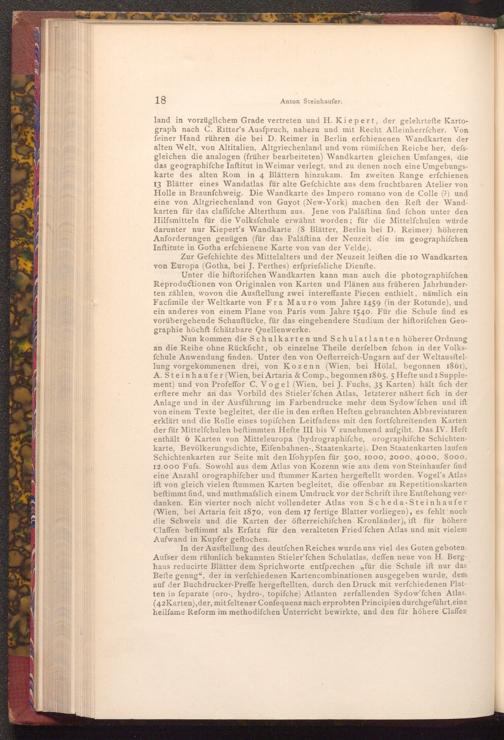 Nun kommen die Schulkarten und Schulatlanten höherer Ordnung an die Reihe ohne Rückficht, ob einzelne Theile derfelben fchon in der Volksfchule Anwendung finden. Unter den von Oefterreich- Ungarn auf der Weltausftellung vorgekommenen drei, von Kozenn( Wien, bei Hölzl, begonnen 1861), A. Steinhaufer( Wien, bei Artaria& Comp., begonnen 1865, 5 Hefte und 1 Supplement) und von Profeffor C. Vogel( Wien, bei J. Fuchs, 35 Karten) hält fich der erftere mehr an das Vorbild des Stieler'fchen Atlas, letzterer nähert fich in der Anlage und in der Ausführung im Farbendrucke mehr dem Sydow'fchen und ift von einem Texte begleitet, der die in den erften Heften gebrauchten Abbreviaturen erklärt und die Rolle eines topifchen Leitfadens mit den fortfchreitenden Karten der für Mittelfchulen beftimmten Hefte III bis V zunehmend aufgibt. Das IV. Heft. enthält 6 Karten von Mitteleuropa( hydrographifche, orographifche Schichtenkarte, Bevölkerungsdichte, Eifenbahnen-, Staatenkarte). Den Staatenkarten laufen Schichtenkarten zur Seite mit den Ifohypfen für 500, 1000, 2000, 4000, 8000, 12.000 Fufs. Sowohl aus dem Atlas von Kozenn wie aus dem von Steinhaufer find eine Anzahl orographifcher und ftummer Karten hergeftellt worden. Vogel's Atlas ift von gleich vielen ftummen Karten begleitet, die offenbar zu Repetitionskarten beftimmt find, und muthmafslich einem Umdruck vor der Schrift ihre Entftehung verdanken. Ein vierter noch nicht vollendeter Atlas von Scheda- Steinhaufer ( Wien, bei Artaria feit 1870, von dem 17 fertige Blatter vorliegen), es fehlt noch die Schweiz und die Karten der öfterreichifchen Kronländer), ift für höhere Claffen beſtimmt als Erfatz für den veralteten Fried'fchen Atlas und mit vielem Aufwand in Kupfer geftochen.