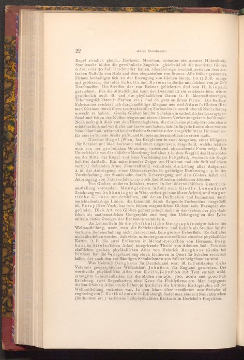 Was Heinrich Berghaus für Deutfchland war, ift in Fufsftapfen diefes Veterans geographifcher Wiffenfchaft Johnfton für England geworden. Der werthvolle phyfikalifche Atlas von Keith Johnfton mit Text enthält wohlarrangirte Schichtenkarten für die Maffen von 250, 500, 2000 und 5000 Fufs Erhebung, zwei Regenkarten, eine Karte für Flufsfyfteme etc. Man begegnete diefem fchönen Atlas um fo lieber, je fpärlicher die britifche Kartographie auf der Weltausstellung vertreten war. In den fchon öfter erwähnten 200 Samples of engraving von J. Bartholomew in Edinburgh findet man eine mit Nebenkärtchen ( Ifothermen etc.) verfehene halbphyfikalifche Erdkarte in Herfchel's Projection.