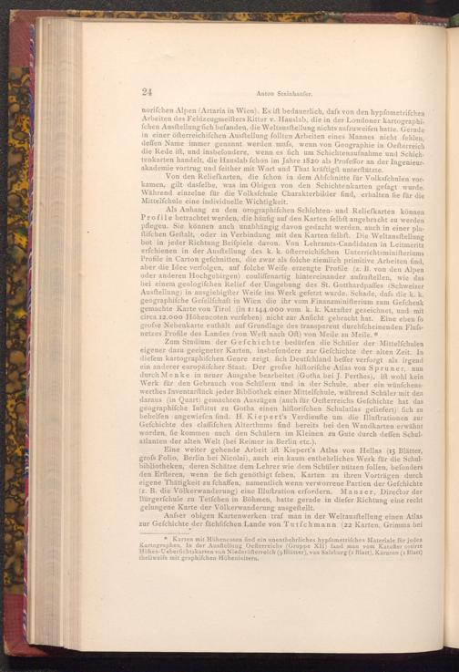 norifchen Alpen( Artaria in Wien). Es ift bedauerlich, dafs von den hypfometrifchen Arbeiten des Feldzeugmeifters Ritter v. Hauslab, die in der Londoner kartographifchen Ausstellung fich befanden, die Weltausftellung nichts aufzuweifen hatte. Gerade in einer öfterreichifchen Ausftellung follten Arbeiten eines Mannes nicht fehlen, deffen Name immer genannt werden mufs, wenn von Geographie in Oefterreich die Rede ift, und insbefondere, wenn es fich um Schichtenaufnahme und Schichtenkarten handelt, die Hauslab fchon im Jahre 1820 als Profeffor an der Ingenieurakademie vortrug und feither mit Wort und That kräftigft unterſtützte.