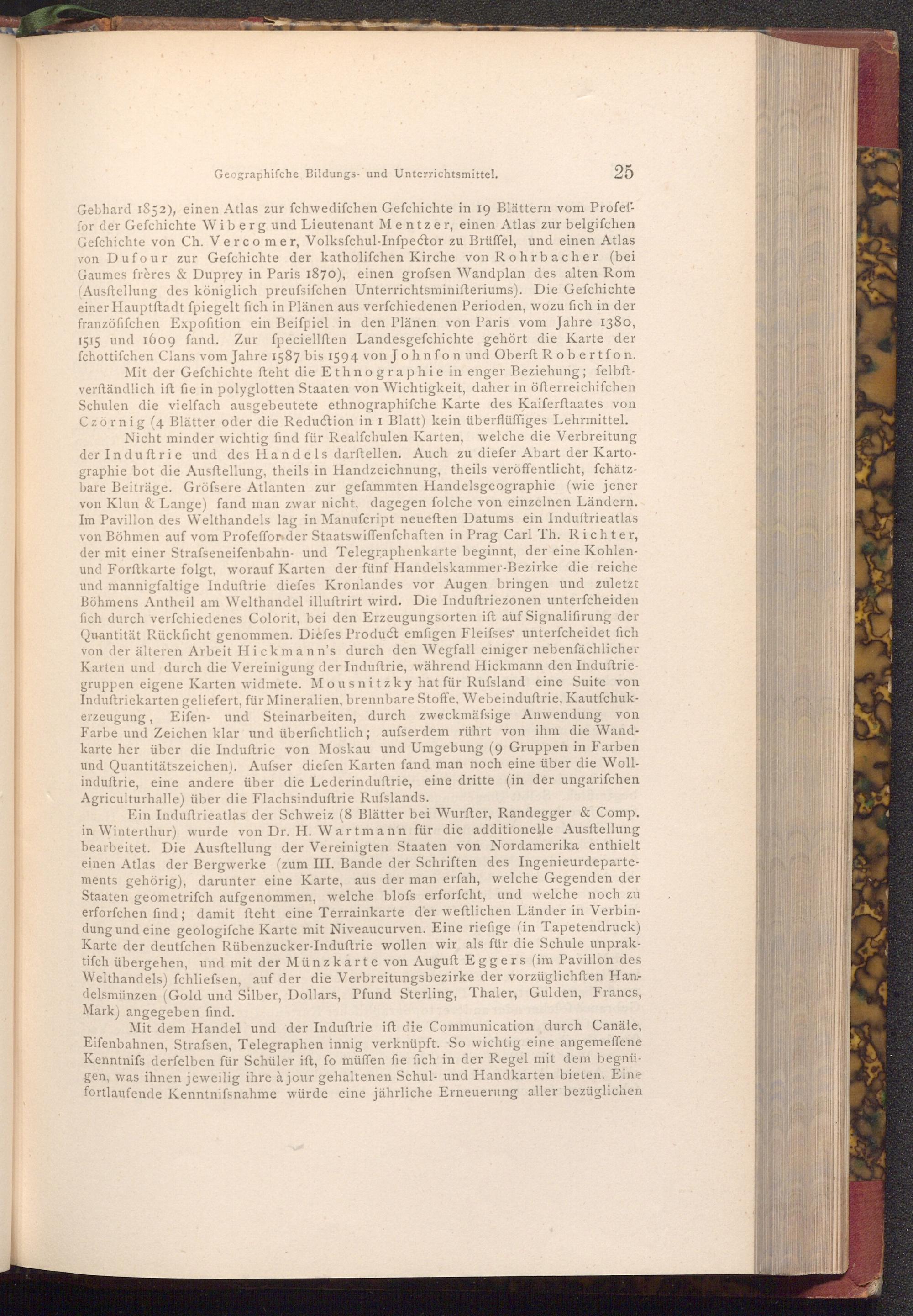 Gebhard 1852), einen Atlas zur fchwedifchen Gefchichte in 19 Blättern vom Profeffor der Gefchichte Wiberg und Lieutenant Mentzer, einen Atlas zur belgifchen Gefchichte von Ch. Vercomer, Volksfchul- Infpector zu Brüffel, und einen Atlas von Dufour zur Gefchichte der katholifchen Kirche von Rohrbacher( bei Gaumes frères& Duprey in Paris 1870), einen grofsen Wandplan des alten Rom ( Ausftellung des königlich preufsifchen Unterrichtsminifteriums). Die Gefchichte einer Hauptftadt fpiegelt fich in Plänen aus verfchiedenen Perioden, wozu fich in der franzöfifchen Expofition ein Beispiel in den Plänen von Paris vom Jahre 1380, 1515 und 1609 fand. Zur fpeciellften Landesgefchichte gehört die Karte der fchottifchen Clans vom Jahre 1587 bis 1594 von Johnfon und Oberft Robertfon. Mit der Gefchichte fteht die Ethnographie in enger Beziehung; felbftverſtändlich ift fie in polyglotten Staaten von Wichtigkeit, daher in öfterreichifchen Schulen die vielfach ausgebeutete ethnographifche Karte des Kaiferftaates von Czörnig( 4 Blätter oder die Reduction in 1 Blatt) kein überflüffiges Lehrmittel.