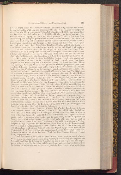 Nicht minder wichtig find für Realfchulen Karten, welche die Verbreitung der Induftrie und des Handels darftellen. Auch zu diefer Abart der Kartographie bot die Ausftellung, theils in Handzeichnung, theils veröffentlicht, fchätzbare Beiträge. Gröfsere Atlanten zur gefammten Handelsgeographie( wie jener von Klun& Lange) fand man zwar nicht, dagegen folche von einzelnen Ländern. Im Pavillon des Welthandels lag in Manufcript neueften Datums ein Induftrieatlas von Böhmen auf vom Profeffor der Staatswiffenfchaften in Prag Carl Th. Richter, der mit einer Strafseneifenbahn- und Telegraphenkarte beginnt, der eine Kohlenund Forftkarte folgt, worauf Karten der fünf Handelskammer- Bezirke die reiche und mannigfaltige Induftrie diefes Kronlandes vor Augen bringen und zuletzt Böhmens Antheil am Welthandel illuftrirt wird. Die Induftriezonen unterfcheiden fich durch verfchiedenes Colorit, bei den Erzeugungsorten ift auf Signalifirung der Quantität Rückficht genommen. Diefes Product emfigen Fleifses unterfcheidet fich von der älteren Arbeit Hickmann's durch den Wegfall einiger nebenfächlicher Karten und durch die Vereinigung der Induftrie, während Hickmann den Induſtriegruppen eigene Karten widmete. Mousnitzky hat für Rufsland eine Suite von Induftriekarten geliefert, für Mineralien, brennbare Stoffe, Webeinduftrie, Kautfchukerzeugung, Eifen- und Steinarbeiten, durch zweckmäfsige Anwendung von Farbe und Zeichen klar und überfichtlich; aufserdem rührt von ihm die Wandkarte her über die Induftrie von Moskau und Umgebung( 9 Gruppen in Farben und Quantitätszeichen). Aufser diefen Karten fand man noch eine über die Wollinduftrie, eine andere über die Lederinduftrie, eine dritte( in der ungarifchen Agriculturhalle) über die Flachsinduftrie Rufslands.