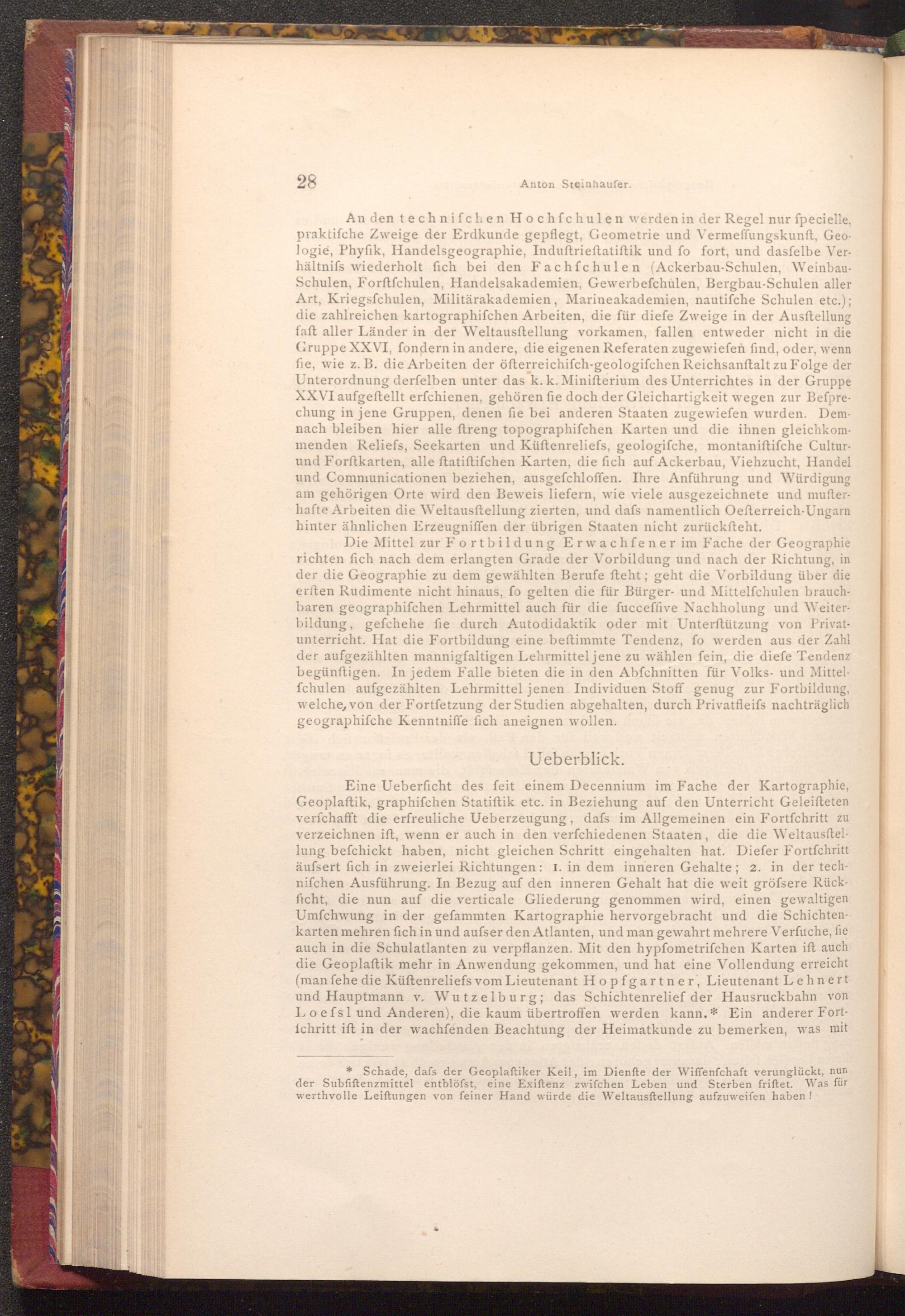 Eine Ueberficht des feit einem Decennium im Fache der Kartographie, Geoplaftik, graphifchen Statiſtik etc. in Beziehung auf den Unterricht Geleifteten verfchafft die erfreuliche Ueberzeugung, dafs im Allgemeinen ein Fortfchritt zu verzeichnen ift, wenn er auch in den verfchiedenen Staaten, die die Weltausftellung befchickt haben, nicht gleichen Schritt eingehalten hat. Diefer Fortfchritt äufsert fich in zweierlei Richtungen: 1. in dem inneren Gehalte; 2. in der technifchen Ausführung. In Bezug auf den inneren Gehalt hat die weit gröfsere Rückficht, die nun auf die verticale Gliederung genommen wird, einen gewaltigen Umfchwung in der gefammten Kartographie hervorgebracht und die Schichtenkarten mehren fich in und aufser den Atlanten, und man gewahrt mehrere Verfuche, fie auch in die Schulatlanten zu verpflanzen. Mit den hypfometriſchen Karten ift auch die Geoplaſtik mehr in Anwendung gekommen, und hat eine Vollendung erreicht ( man fehe die Küftenreliefs vom Lieutenant Hopfgartner, Lieutenant Lehnert und Hauptmann v. Wutzelburg; das Schichtenrelief der Hausruckbahn von Loefslund Anderen), die kaum übertroffen werden kann,* Ein anderer Fortfchritt ift in der wachfenden Beachtung der Heimatkunde zu bemerken, was mit