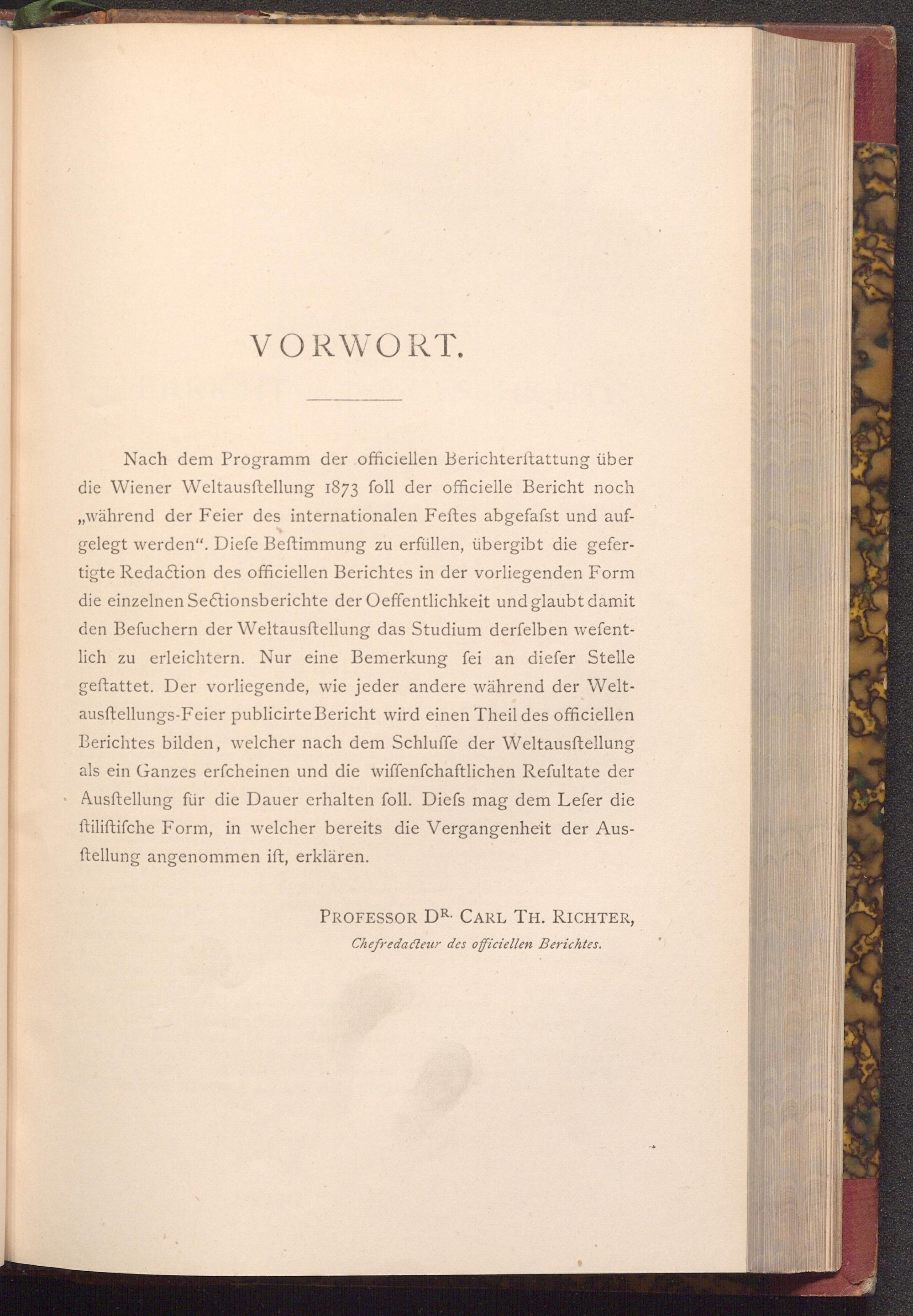 Nach dem Programm der officiellen Berichterstattung über die Wiener Weltausftellung 1873 foll der officielle Bericht noch ,, während der Feier des internationalen Feftes abgefafst und aufgelegt werden". Diefe Beftimmung zu erfüllen, übergibt die gefertigte Redaction des officiellen Berichtes in der vorliegenden Form die einzelnen Sectionsberichte der Oeffentlichkeit und glaubt damit den Befuchern der Weltausstellung das Studium derfelben wefentlich zu erleichtern. Nur eine Bemerkung fei an diefer Stelle geftattet. Der vorliegende, wie jeder andere während der Weltausftellungs- Feier publicirte Bericht wird einen Theil des officiellen Berichtes bilden, welcher nach dem Schluffe der Weltausftellung als ein Ganzes erfcheinen und die wiffenfchaftlichen Refultate der Ausstellung für die Dauer erhalten foll. Diefs mag dem Lefer die ftiliftifche Form, in welcher bereits die Vergangenheit der Ausftellung angenommen ift, erklären.