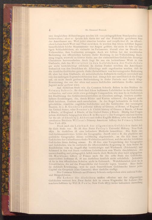 Auf derfelben Stufe wie die Common Schools ftehen in den Städten die Primary Schools, für diefe find fchon beftimmte Lehrbücher in der Gefchichte vorhanden, und zwar nicht etwa gedrängte Compendien, wie man fie in Oefterreich feit Einführung des Gefchichtsunterrichtes zu fchreiben anfängt, fondern ausführlichere Erzählungen, die, durch Bilder und Karten erläutert, die Jugend nicht blofs belehren, fondern auch unterhalten. In der Regel behandeln fie blofs die griechifche, römifche, englifche Gefchichte: und die Gefchichte der vereinigten Staaten, fo z. B. Goodrich pictorial hiftory of Greece, of Rome, of England of the United States, oder Bonner's A Childs history of Greece 2 Bände, of Rome 2 Bände, of England 2 Bände, of the United States 3 Bände. Häufig find Fragen jedem Abſchnitte beigegeben wie z. B. in Harper's( des Verlegers) ancient history for the ufe of fchools by J. Abbott und deffen Engliſh Hiftory oder bei dem fchon erwähnten Büchlein Willson's Primary American hiftory for Primary Schools New- York 1871.