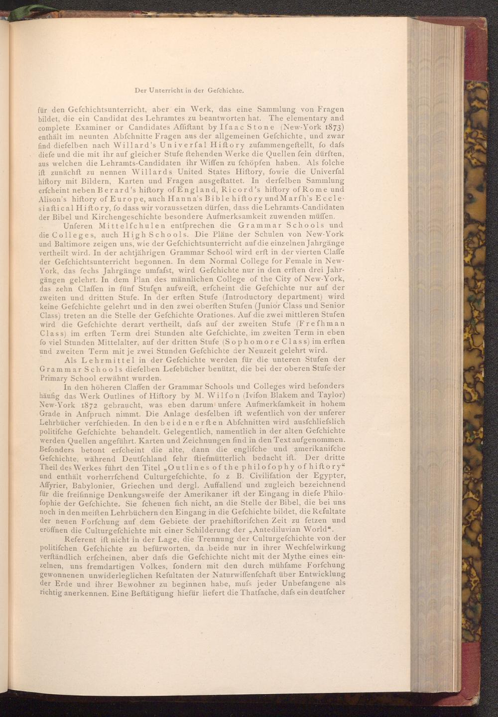 für den Gefchichtsunterricht, aber ein Werk, das eine Sammlung von Fragen bildet, die ein Candidat des Lehramtes zu beantworten hat. The elementary and complete Examiner or Candidates Affiftant by Ifaac Stone( New- York 1873) enthält im neunten Abfchnitte Fragen aus der allgemeinen Gefchichte, und zwar find diefelben nach Willard's Univerfal Hiftory zufammengeftellt, fo dafs diefe und die mit ihr auf gleicher Stufe ftehenden Werke die Quellen fein dürften, aus welchen die Lehramts- Candidaten ihr Wiffen zu fchöpfen haben. Als folche ift zunächst zu nennen Willards United States Hiftory, fowie die Univerfal hiftory mit Bildern, Karten und Fragen ausgeftattet. In derfelben Sammlung erfcheint neben Berard's hiftory of England, Ricord's hiftory of Rome und Alison's hiftory of Europe, auch Hanna's Bible hiftory und Marfh's Ecclesiaftical Hiftory, fo dass wir voraussetzen dürfen, dass die Lehramts- Candidaten der Bibel und Kirchengeschichte besondere Aufmerksamkeit zuwenden müffen.