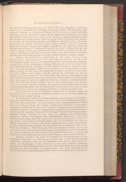 Unferen Mittelfchulen entſprechen die Grammar Schools und die Colleges, auch High Schools. Die Pläne der Schulen von New- York und Baltimore zeigen uns, wie der Gefchichtsunterricht auf die einzelnen Jahrgänge vertheilt wird. In der achtjährigen Grammar School wird erft in der vierten Claffe der Gefchichtsunterricht begonnen. In dem Normal College for Female in NewYork, das fechs Jahrgänge umfafst, wird Gefchichte nur in den erften drei Jahrgängen gelehrt. In dem Plan des männlichen College of the City of New- York, das zehn Claffen in fünf Stufen aufweift, erfcheint die Gefchichte nur auf der zweiten und dritten Stufe. In der erften Stufe( Introductory department) wird keine Gefchichte gelehrt und in den zwei oberften Stufen( Junior Class und Senior Class) treten an die Stelle der Gefchichte Orationes. Auf die zwei mittleren Stufen wird die Gefchichte derart vertheilt, dafs auf der zweiten Stufe( Freſhman Class) im erften Term drei Stunden alte Gefchichte, im zweiten Term in eben fo viel Stunden Mittelalter, auf der dritten Stufe( Sophomore Class) im erften und zweiten Term mit je zwei Stunden Gefchichte der Neuzeit gelehrt wird.