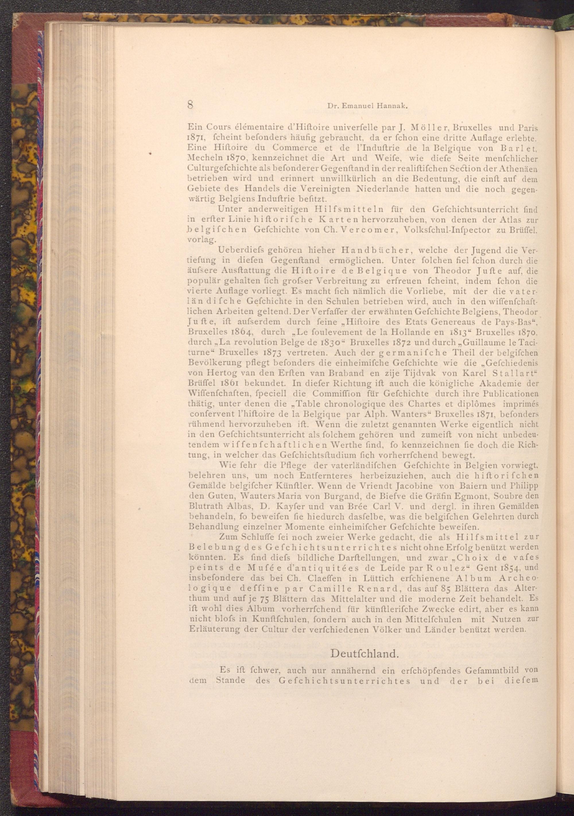 Ein Cours élémentaire d'Hiftoire univerfelle par J. Möller, Bruxelles und Paris 1871, fcheint befonders häufig gebraucht, da er fchon eine dritte Auflage erlebte. Eine Hiftoire du Commerce et de l'Induftrie de la Belgique von Barlet, Mecheln 1870, kennzeichnet die Art und Weife, wie diefe Seite menfchlicher Culturgefchichte als befonderer Gegenftand in der realiftifchen Section der Athenäen betrieben wird und erinnert unwillkürlich an die Bedeutung, die einft auf dem Gebiete des Handels die Vereinigten Niederlande hatten und die noch gegenwärtig Belgiens Induftrie befitzt.