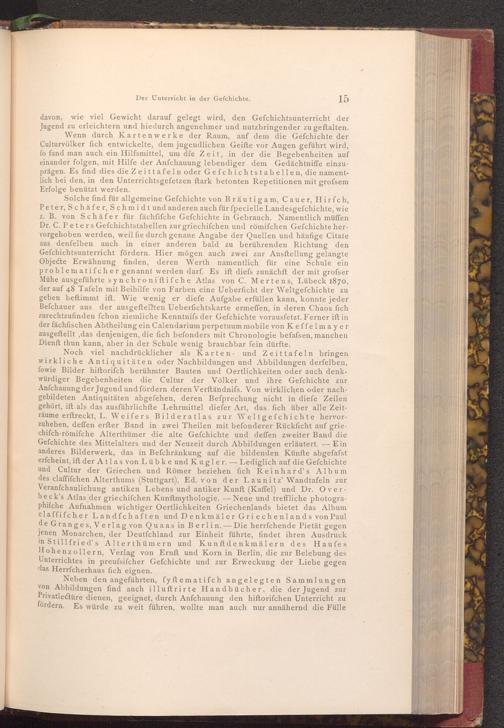 Solche find für allgemeine Gefchichte von Bräutigam, Cauer, Hirfch, Peter, Schäfer, Schmidt und anderen auch für fpecielle Landesgefchichte, wie z. B. von Schäfer für fächfifche Gefchichte in Gebrauch. Namentlich müffen Dr. C. Peters Gefchichtstabellen zur griechifchen und römifchen Gefchichte hervorgehoben werden, weil fie durch genaue Angabe der Quellen und häufige Citate aus denfelben auch in einer anderen bald zu berührenden Richtung den Gefchichtsunterricht fördern. Hier mögen auch zwei zur Ausftellung gelangte Objecte Erwähnung finden, deren Werth namentlich für eine Schule ein problematifcher genannt werden darf. Es ift diefs zunächft der mit grofser Mühe ausgeführte synchroniftifche Atlas von C. Mertens, Lübeck 1870, der auf 48 Tafeln mit Beihilfe von Farben eine Ueberficht der Weltgefchichte zu geben beftimmt ift. Wie wenig er diefe Aufgabe erfüllen kann, konnte jeder Befchauer aus der ausgeftellten Ueberfichtskarte ermeffen, in deren Chaos fich zurechtzufinden fchon ziemliche Kenntnifs der Gefchichte vorausfetzt. Ferner ift in der fächfischen Abtheilung ein Calendarium perpetuum mobile von Keffelmayer ausgeftellt, das denjenigen, die fich befonders mit Chronologie befafsen, manchen Dienft thun kann, aber in der Schule wenig brauchbar fein dürfte.