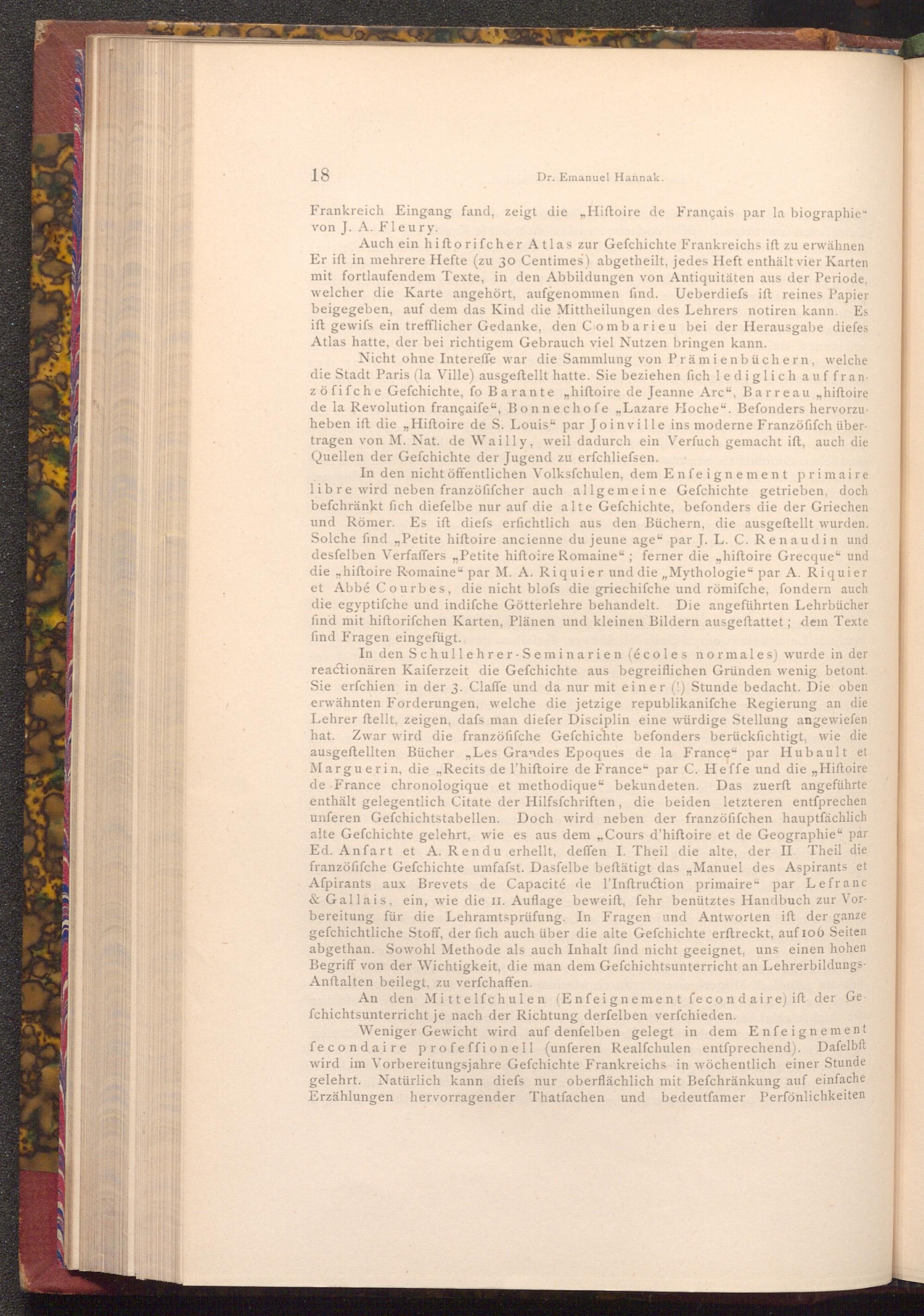 In den Schullehrer- Seminarien( écoles normales) wurde in der reactionären Kaiferzeit die Gefchichte aus begreiflichen Gründen wenig betont. Sie erſchien in der 3. Claffe und da nur mit einer(!) Stunde bedacht. Die oben erwähnten Forderungen, welche die jetzige republikanifche Regierung an die Lehrer ftellt, zeigen, dafs man diefer Disciplin eine würdige Stellung angewiefen hat. Zwar wird die franzöfifche Gefchichte befonders berücksichtigt, wie die ausgeftellten Bücher Les Grandes Epoques de la France" par Hubault et Marguerin, die ,, Recits de l'hiftoire de France" par C. Heffe und die ,, Hiftoire de France chronologique et methodique" bekundeten. Das zuerft angeführte enthält gelegentlich Citate der Hilfsfchriften, die beiden letzteren entſprechen unferen Gefchichtstabellen. Doch wird neben der franzöfifchen hauptfächlich alte Gefchichte gelehrt, wie es aus dem„, Cours d'hiftoire et de Geographie" par Ed. Anfart et A. Rendu erhellt, deffen I. Theil die alte, der II. Theil die franzöfifche Gefchichte umfafst. Dasfelbe beftätigt das„ Manuel des Aspirants et Afpirants aux Brevets de Capacité de l'Inftruction primaire" par Lefranc & Gallais, ein, wie die II. Auflage beweift, fehr benütztes Handbuch zur Vorbereitung für die Lehramtsprüfung. In Fragen und Antworten ift der ganze gefchichtliche Stoff, der fich auch über die alte Gefchichte erftreckt, auf 106 Seiten abgethan. Sowohl Methode als auch Inhalt find nicht geeignet, uns einen hohen Begriff von der Wichtigkeit, die man dem Gefchichtsunterricht an LehrerbildungsAnftalten beilegt, zu verfchaffen.
