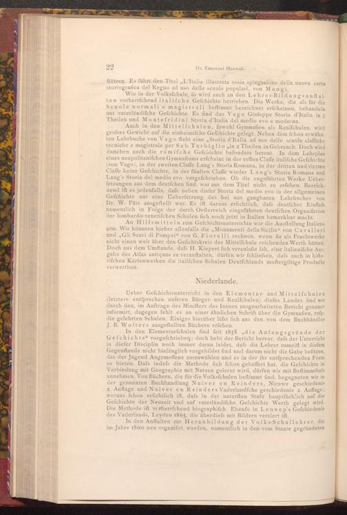Wie in der Volksfchule, fo wird auch an den Lehrer- Bildungsanft alten vorherrfchend italifche Gefchichte betrieben. Die Werke, die als für die Scuole normali e magistrali beftimmt bezeichnet erfcheinen, behandeln nur vaterländifche Gefchichte. Es find das Vago Giuſeppe Storia d'Italia in 3 Theilen und Montefridini Storia d'Italia del medio evo e moderna.