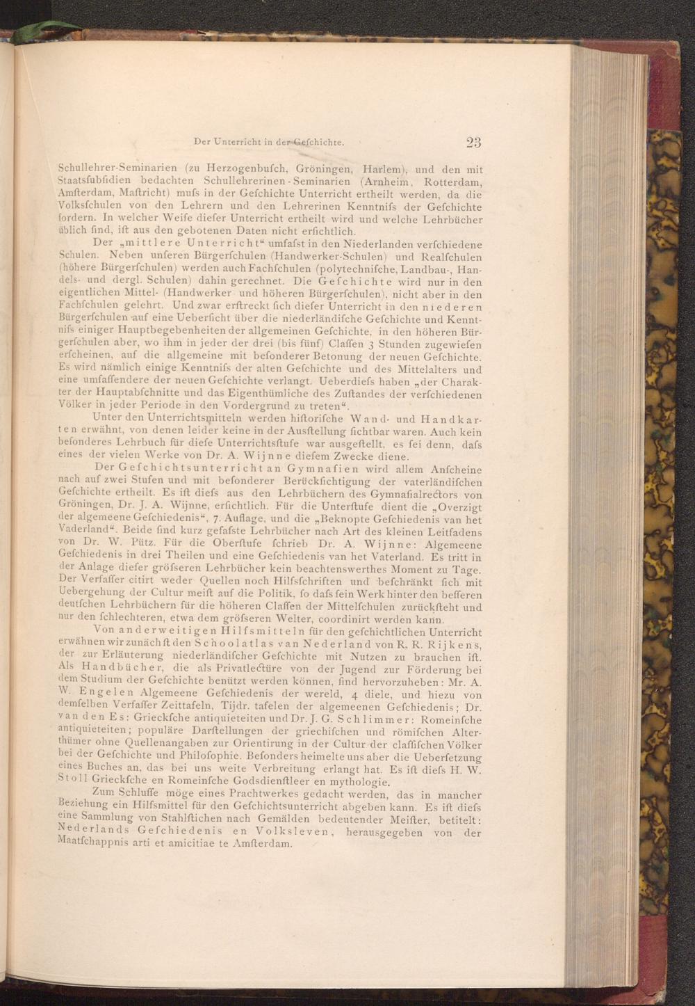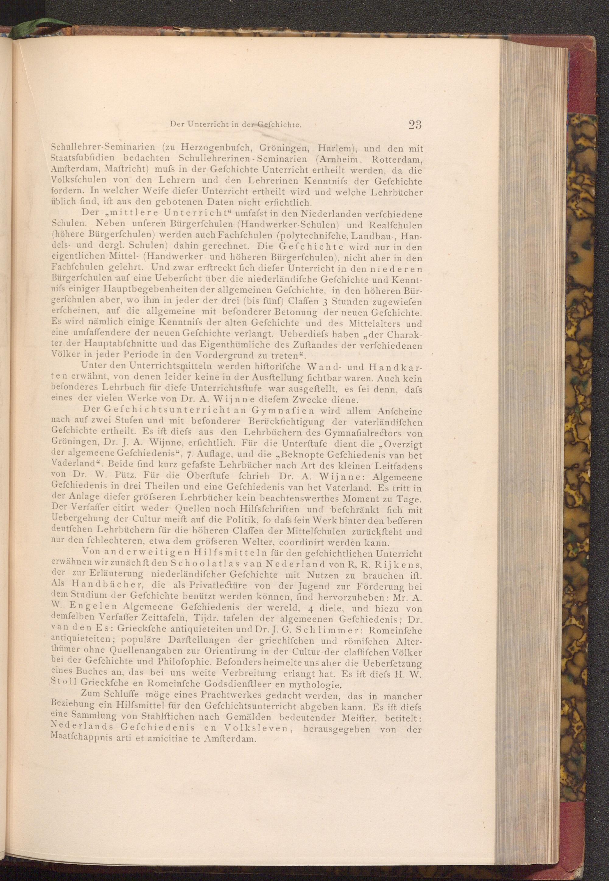 Der„ mittlere Unterricht" umfafst in den Niederlanden verfchiedene Schulen. Neben unferen Bürgerfchulen( Handwerker- Schulen) und Realfchulen ( höhere Bürgerfchulen) werden auch Fachschulen( polytechnifche, Landbau-, Handels- und dergl. Schulen) dahin gerechnet. Die Gefchichte wird nur in den eigentlichen Mittel-( Handwerker und höheren Bürgerfchulen), nicht aber in den Fachſchulen gelehrt. Und zwar erftreckt fich diefer Unterricht in den niederen Bürgerfchulen auf eine Ueberficht über die niederländifche Gefchichte und Kenntnifs einiger Hauptbegebenheiten der allgemeinen Gefchichte, in den höheren Bürgerfchulen aber, wo ihm in jeder der drei( bis fünf) Claffen 3 Stunden zugewiefen erfcheinen, auf die allgemeine mit befonderer Betonung der neuen Gefchichte. Es wird nämlich einige Kenntnifs der alten Gefchichte und des Mittelalters und eine umfaffendere der neuen Gefchichte verlangt. Ueberdiefs haben, der Charakter der Hauptabfchnitte und das Eigenthümliche des Zuftandes der verfchiedenen Völker in jeder Periode in den Vordergrund zu treten".