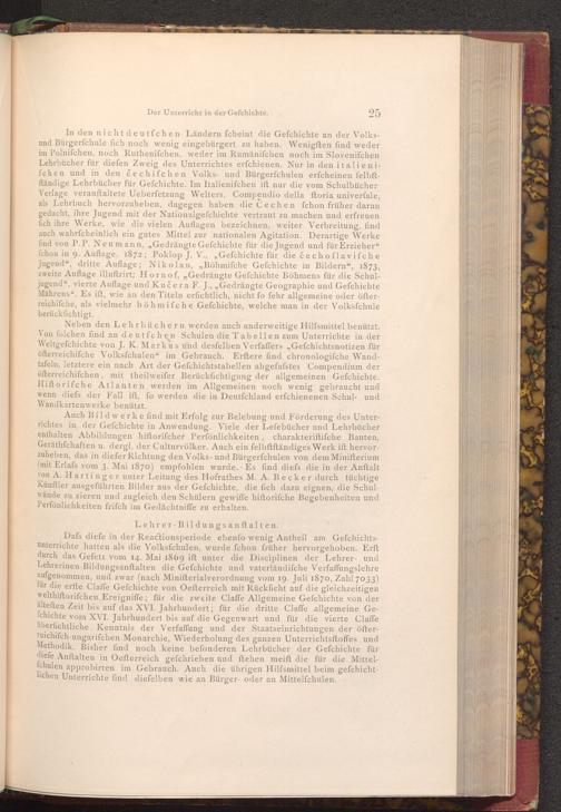 Neben den Lehrbüchern werden auch anderweitige Hilfsmittel benützt. Von folchen find an deutfchen Schulen die Tabellen zum Unterrichte in der Weltgefchichte von J. K. Markus und desfelben Verfaffers Gefchichtsnotizen für öfterreichifche Volksfchulen" im Gebrauch. Erftere find chronologifche Wandtafeln, letztere ein nach Art der Gefchichtstabellen abgefafstes Compendium der öfterreichifchen, mit theilweifer Berücksichtigung der allgemeinen Gefchichte. Hiftorifche Atlanten werden im Allgemeinen noch wenig gebraucht und wenn diefs der Fall ift, fo werden die in Deutſchland erfchienenen Schul- und Wandkartenwerke benützt.