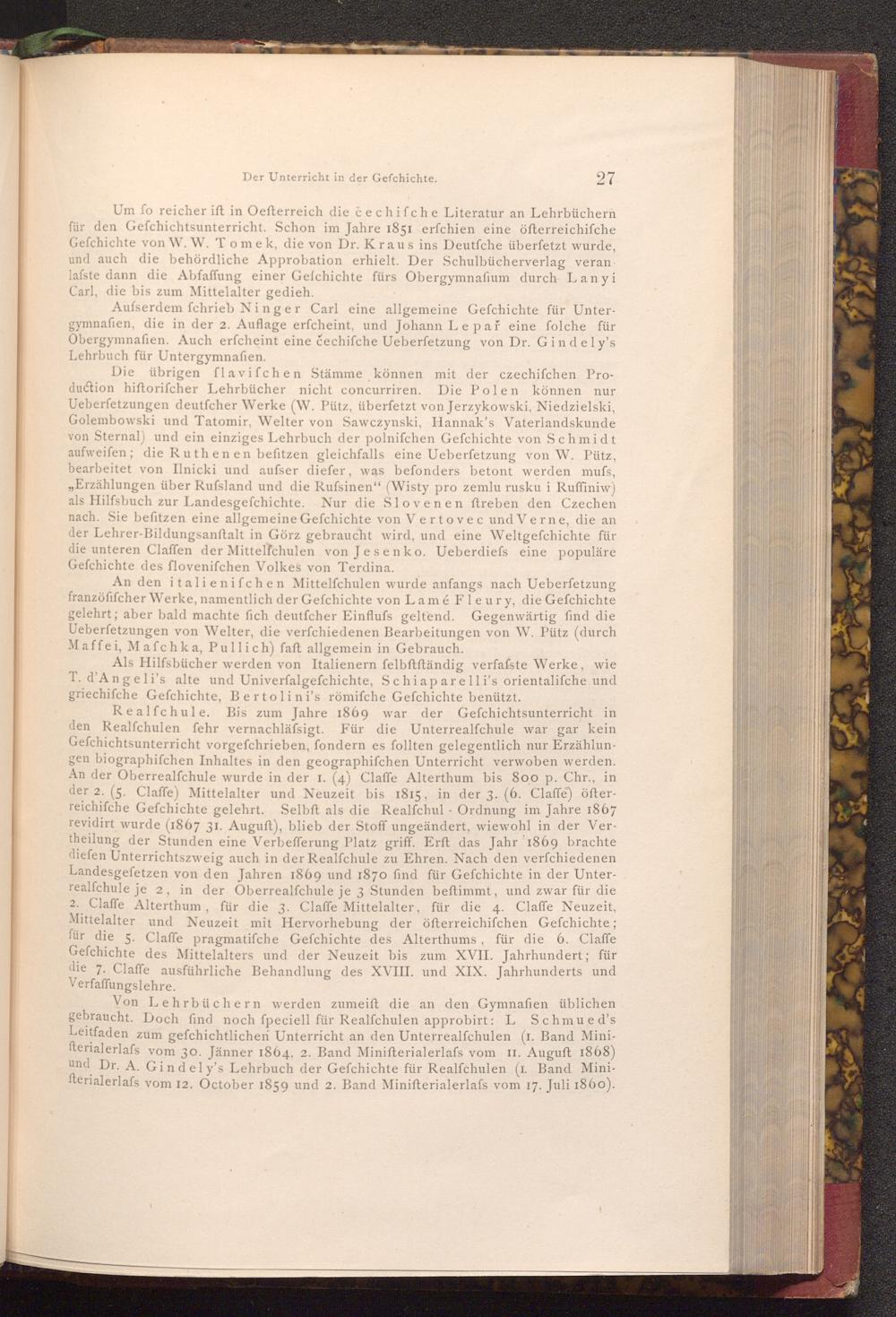 Von Lehrbüchern werden zumeift die an den Gymnafien üblichen gebraucht. Doch find noch fpeciell für Realfchulen approbirt: L Schmued's Leitfaden zum gefchichtlichen Unterricht an den Unterrealfchulen( 1. Band Minifterialerlafs vom 30. Jänner 1864, 2. Band Minifterialerlafs vom II. Auguft 1868) und Dr. A. Gindely's Lehrbuch der Gefchichte für Realfchulen( 1. Band Minifterialerlafs vom 12. October 1859 und 2. Band Minifterialerlafs vom 17. Juli 1860).