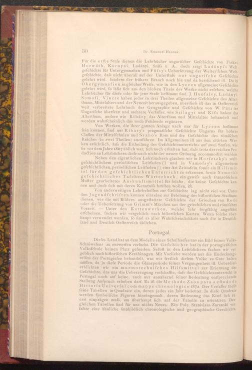 Für die erfte Stufe dienen die Lehrbücher ungarifcher Gefchichte von Finkei, Horwáth, Környai, Ladányi, Száfs u. A., doch zeigt Ladányi's Weltgefchichte für Untergymnafien und Füfsy's Ueberfetzung der Welter'fchen Weltgefchichte, dafs nicht überall auf der Unterftufe nur ungarifche Gefchichte gelehrt wird, fondern der frühere Brauch noch hie und da herrfchend ift. Da in Obergymnafien in gleicher Weife, wie in den Lyceen allgemeine Gefchichte gelehrt wird, fo läfst fich aus den blofsen Titeln der Werke nicht erfehen, welche Lehrbücher für diefe oder für jene Stufe beftimmt find. J. Hunfalvy, Ladányi, Somofi, Vincze haben jeder in drei Theilen allgemeine Gefchichte des Alterthums, Mittelalters und der Neuzeit herausgegeben, überdiefs ift das in Oefterreich weit verbreitete Lehrbuch der Geographie und Gefchichte von W. Pütz ins Ungarifche überfetzt und mehrere Verfaffer, wie Szilagyi und Kifs haben das Alterthum, andere wie Ribáry das Alterthum und Mittelalter behandelt und werden wahrfcheinlich das noch Fehlende ergänzen.