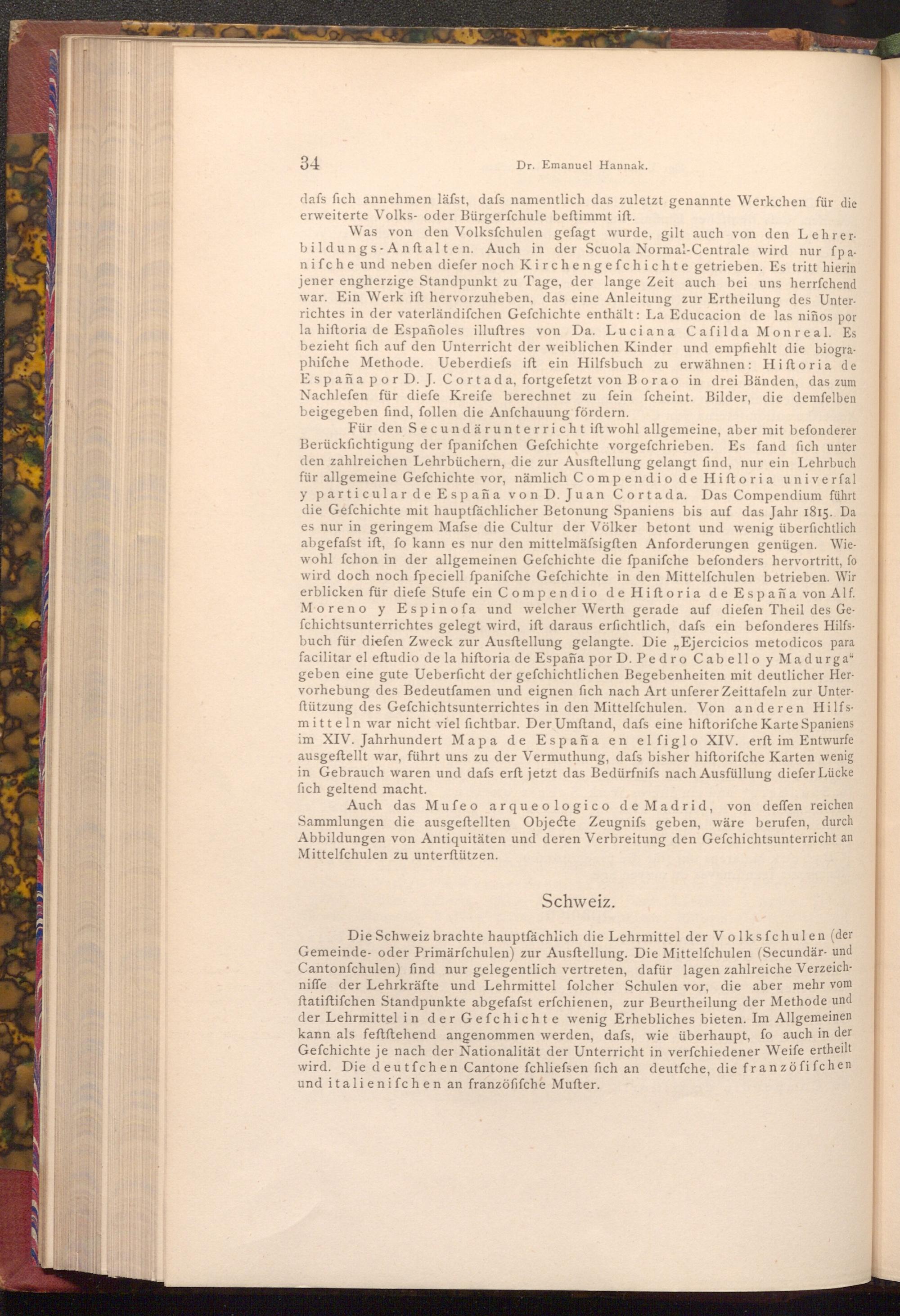 Was von den Volksfchulen gefagt wurde, gilt auch von den Lehrerbildungs- Anstalten. Auch in der Scuola Normal- Centrale wird nur fpanifche und neben diefer noch Kirchengefchichte getrieben. Es tritt hierin jener engherzige Standpunkt zu Tage, der lange Zeit auch bei uns herrfchend war. Ein Werk ift hervorzuheben, das eine Anleitung zur Ertheilung des Unterrichtes in der vaterländifchen Gefchichte enthält: La Educacion de las niños por la hiftoria de Españoles illuftres von Da. Luciana Cafilda Monreal. Es bezieht fich auf den Unterricht der weiblichen Kinder und empfiehlt die biographifche Methode. Ueberdiefs ift ein Hilfsbuch zu erwähnen: Hiftoria de España por D. J. Cortada, fortgefetzt von Borao in drei Bänden, das zum Nachlefen für diefe Kreife berechnet zu fein fcheint. Bilder, die demfelben beigegeben find, follen die Anfchauung fördern.