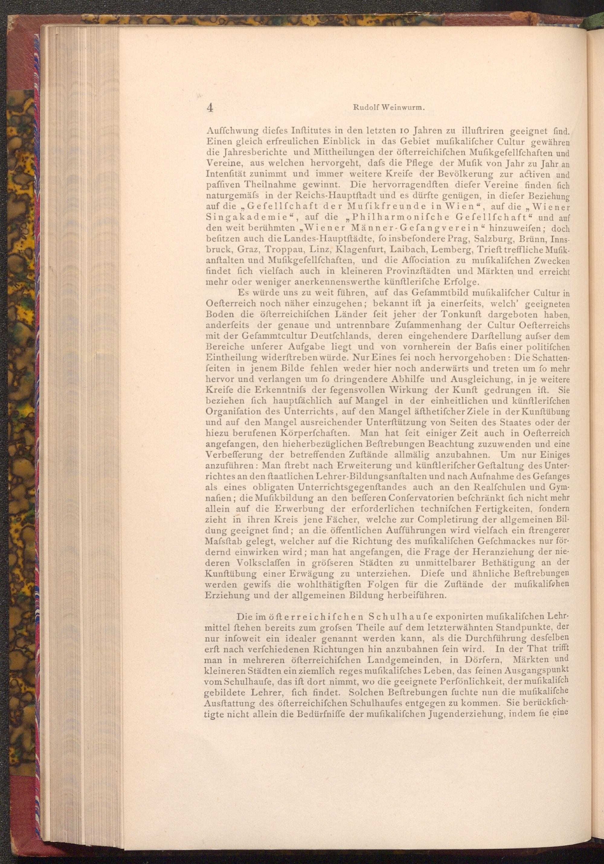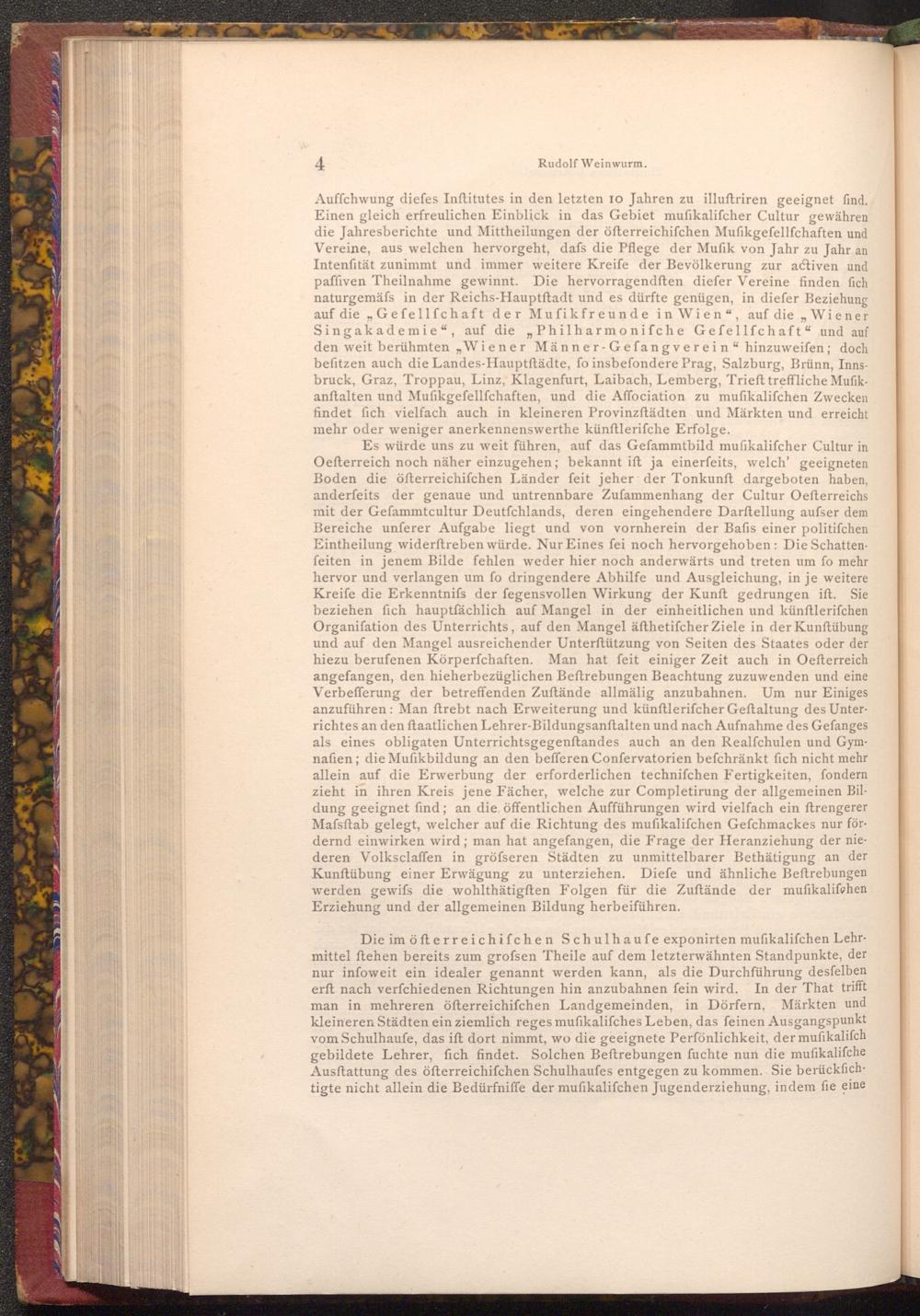 Auffchwung diefes Inftitutes in den letzten 10 Jahren zu illuftriren geeignet find. Einen gleich erfreulichen Einblick in das Gebiet mufikalifcher Cultur gewähren die Jahresberichte und Mittheilungen der öfterreichifchen Mufikgefellſchaften und Vereine, aus welchen hervorgeht, dafs die Pflege der Mufik von Jahr zu Jahr an Intenfität zunimmt und immer weitere Kreife der Bevölkerung zur activen und paffiven Theilnahme gewinnt. Die hervorragendften diefer Vereine finden fich naturgemäss in der Reichs- Hauptftadt und es dürfte genügen, in diefer Beziehung auf die Gefellfchaft der Mufikfreunde in Wien", auf die ,, Wiener Singakademie", auf die" Philharmonifche Gefellfchaft" und auf den weit berühmten, Wiener Männer- Gefangverein" hinzuweifen; doch befitzen auch die Landes- Hauptftädte, fo insbefondere Prag, Salzburg, Brünn, Innsbruck, Graz, Troppau, Linz, Klagenfurt, Laibach, Lemberg, Trieft treffliche Mufikanftalten und Mufikgefellſchaften, und die Affociation zu mufikalifchen Zwecken findet fich vielfach auch in kleineren Provinzftädten und Märkten und erreicht mehr oder weniger anerkennenswerthe künftlerifche Erfolge.