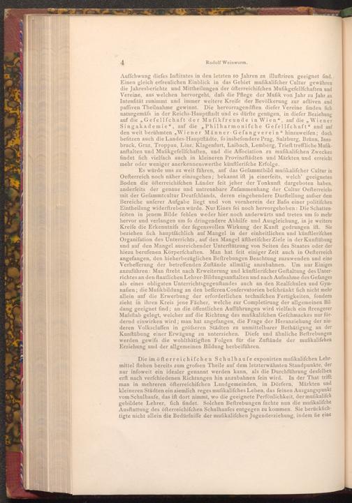 Es würde uns zu weit führen, auf das Gefammtbild mufikalifcher Cultur in Oefterreich noch näher einzugehen; bekannt ift ja einerfeits, welch' geeigneten Boden die öfterreichifchen Länder feit jeher der Tonkunft dargeboten haben, anderfeits der genaue und untrennbare Zufammenhang der Cultur Oefterreichs mit der Gefammtcultur Deutſchlands, deren eingehendere Darftellung aufser dem Bereiche unferer Aufgabe liegt und von vornherein der Bafis einer politifchen Eintheilung widerftreben würde. Nur Eines fei noch hervorgehoben: Die Schattenfeiten in jenem Bilde fehlen weder hier noch anderwärts und treten um fo mehr hervor und verlangen um fo dringendere Abhilfe und Ausgleichung, in je weitere Kreife die Erkenntnifs der fegensvollen Wirkung der Kunft gedrungen ift. Sie beziehen fich hauptfächlich auf Mangel in der einheitlichen und künftlerifchen Organiſation des Unterrichts, auf den Mangel äfthetifcher Ziele in der Kunftübung und auf den Mangel ausreichender Unterſtützung von Seiten des Staates oder der hiezu berufenen Körperfchaften. Man hat feit einiger Zeit auch in Oefterreich angefangen, den hieherbezüglichen Beftrebungen Beachtung zuzuwenden und eine Verbefferung der betreffenden Zuftände allmälig anzubahnen. Um nur Einiges anzuführen: Man ftrebt nach Erweiterung und künftlerifcher Geftaltung des Unterrichtes an den ftaatlichen Lehrer- Bildungsanftalten und nach Aufnahme des Gefanges als eines obligaten Unterrichtsgegenstandes auch an den Realfchulen und Gymnafien; die Mufikbildung an den befferen Confervatorien befchränkt fich nicht mehr allein auf die Erwerbung der erforderlichen techniſchen Fertigkeiten, fondern zieht in ihren Kreis jene Fächer, welche zur Completirung der allgemeinen Bildung geeignet find; an die öffentlichen Aufführungen wird vielfach ein ftrengerer Mafsftab gelegt, welcher auf die Richtung des mufikalifchen Gefchmackes nur fördernd einwirken wird; man hat angefangen, die Frage der Heranziehung der niederen Volksclaffen in gröfseren Städten zu unmittelbarer Bethätigung an der Kunftübung einer Erwägung zu unterziehen. Diefe und ähnliche Beftrebungen werden gewifs die wohlthätigften Folgen für die Zuftände der mufikalifchen Erziehung und der allgemeinen Bildung herbeiführen.