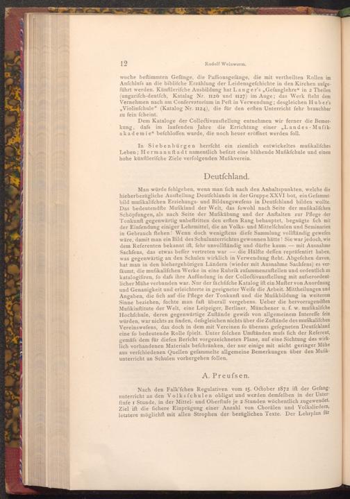 Man würde fehlgehen, wenn man fich nach den Anhaltspunkten, welche die hieherbezügliche Ausftellung Deutfchlands in der Gruppe XXVI bot, ein Gefammtbild mufikalifchen Erziehungs- und Bildungswefens in Deutſchland bilden wollte. Das bedeutendfte Mufikland der Welt, das fowohl nach Seite der mufikalifchen Schöpfungen, als nach Seite der Mufikübung und der Anftalten zur Pflege der Tonkunft gegenwärtig unbeftritten den erften Rang behauptet, begnügte fich mit der Einfendung einiger Lehrmittel, die an Volks- und Mittelfchulen und Seminarien in Gebrauch ſtehen! Wenn doch wenigftens diefe Sammlung vollſtändig gewefen wäre, damit man ein Bild des Schulunterrichtes gewonnen hätte! Sie war jedoch, wie dem Referenten bekannt ift, fehr unvollständig und dürfte kaum mit Ausnahme Sachfens, das etwas beffer vertreten war die Hälfte deffen repräfentirt haben, was gegenwärtig an den Schulen wirklich in Verwendung fteht. Abgefehen davon, hat man in den hiehergehörigen Ländern( wieder mit Ausnahme Sachfens) es verfäumt, die mufikalifchen Werke in eine Rubrik zufammenzuftellen und ordentlich zu katalogifiren, fo dafs ihre Auffindung in der Collectivausftellung mit aufserordentlicher Mühe verbunden war. Nur der fächfifche Katalog ift ein Muſter von Anordnung und Genauigkeit und erleichterte in geeigneter Weife die Arbeit. Mittheilungen und Angaben, die fich auf die Pflege der Tonkunft und die Mufikbildung in weiterem Sinne beziehen, fuchte man faft überall vergebens. Ueber die hervorragendften Mufikinftitute der Welt, eine Leipziger, Berliner, Münchener u. f. w. mufikalifche Hochfchule, deren gegenwärtige Zuftände gewifs von allgemeinem Intereffe fein würden, war nichts zu finden, defsgleichen nichts über die Zuftände des muſikaliſchen Vereinswefens, das doch in dem mit Vereinen fo überaus gefegneten Deutfchland eine fo bedeutende Rolle fpielt. Unter folchen Umftänden mufs fich der Referent, gemäfs dem für diefen Bericht vorgezeichneten Plane, auf eine Sichtung des wirklich vorhandenen Materials befchränken, der nur einige mit nicht geringer Mühe aus verfchiedenen Quellen gefammelte allgemeine Bemerkungen über den Musikunterricht an Schulen vorhergehen follen.