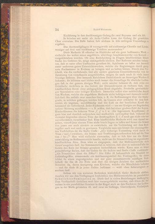 Diefe Methode ift offenbar im Hinblicke auf ein ganz beftimmtes Werk- vielleicht das weiter unten angeführte, allerdings beachtenswerthe von Kotzolt- vorgefchrieben worden. Ob eine Entfcheidung in Fragen künftlerifchen Inhalts Sache des Gefetzes fei, möge dahingeftellt bleiben. Der Referent möchte behaupten, dafs es unter allen Umftänden gerathen fei, Spielraum zu laffen zur Auswahl unter mehreren guten Unterrichtswerken, welche die Regierungen durch geeig. nete Fachmänner in Evidenz zu bringen und zu halten hätten. Durch eine Vorfchrift, wie die vorftehende, find alle anders gearteten Unterrichtswerke von der Benützung von vorneherein ausgefchloffen, mögen fie auch noch fo viele innere Vorzüge befitzen. Der immenfe Reichthum Deutſchlands an derartigen Werken ift bekannt; fie bildeten und bilden noch immer die, Grundlage für ähnliche Leiftungen faft in der ganzen übrigen Welt; nicht minder bekannt ift, dafs etwa zwei Dritttheile derfelben in das Gebiet der Dutzendwaaren zu rechnen find, ohne künftlerifchen Beruf, ohne pädagogifchen Ernft abgefafst, Producte gewinnfüchti ger Speculation oder leidiger Eitelkeit. Immerhin reftirt eine anfehnliche Anzahl von Werken, welche die angeführte Methode nicht befolgen und dennoch vortreff lich find. Sie enthält zwar manches Gute, z. B. die Beftimmungen über die Stärkegrade, in welchen gefungen werden foll, im Ganzen aber erfcheint fie dem Referenten als ungenau, unvollständig und die Luft an der herrlichen Kunft eher hemmend als befördernd. Jeder Fachmann wird um nur Einiges zur Begründung unferer Meinung anzuführen- z. B. wiffen, dafs bei einer grofsen Zahl der SopranKinderftimmen die höheren Töne f, g u. f. w.( die fogenannte Kopfftimme) oft ganz klar und deutlich anfprechen und mufikalifch verwendbar find, während die darunter liegenden oberen Töne des Bruftregifters h, c, d noch gar nicht oder nur unvollkommen vernehmbar find. Eine künftlerifche Methode wird nun darauf ausgehen, vorerft jene oberen Töne nicht brach liegen zu laffen und ferner die Stimme von jenen aus nach abwärts zu entwickeln, um die Verbindung mit dem Bruftregifter nach und nach zu gewinnen. Vergleiche man nun hiemit die obenangeführ ten Vorfchriften für die fünfte Claffe:„ Der bisherige Tonumfang wird durch die Töne é und erweitert; die Stimm- und Treffübungen erftrecken fich auf die Töne von bis f." Man wird vielleicht einwenden, dafs es fich hier um die Stimmentwicklung im Maffenunterricht handle, nicht um die Stimmbildung im eigentlichen künftlerifchen Sinn. Dem wäre zu entgegnen, dafs der Maffenunterricht nicht darauf ausgehen darf, das Stimmmaterial zu ruiniren, dafs aber in unferem Falle das Gefetz den Ruin der Stimme geradezu herbeiführen würde. Kann man es ferner gerechtfertigt finden, dafs das Gefetz für die fechste und fünfte Claffe vorfchreibt: Als Tonzeichen dient die Ziffer"? Die Ziffer ift bekanntlich ein Sinnbild des. Zahlenbegriffes, nimmermehr ein Anfchauungsmittel des Tonbegriffes, für diefen bildet fie einen ungenügenden und nur ganz ausnahmsweife zuläffigen Nothbehelf, für ihn ift die Note und find die übrigen Zeichen der mufikalifchen Notation da, deren Aneignung man Kindern, welche die Mittelfchule befuchen und für diefe ift ja jenes Gefetz beftimmt wohl ohne Schwierigkeit zumuthen darf.