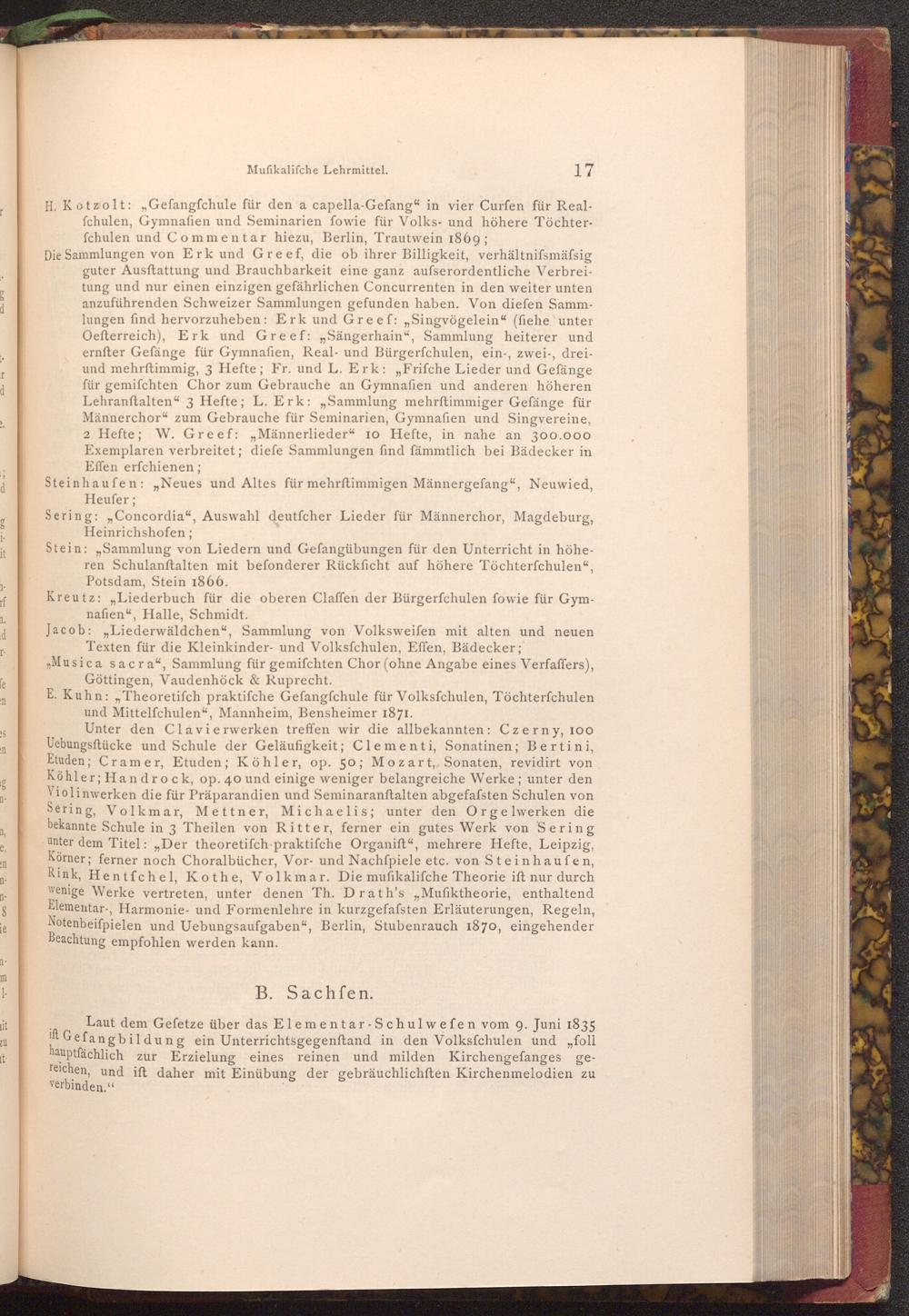 Die Sammlungen von Erk und Greef, die ob ihrer Billigkeit, verhältnifsmässig guter Ausftattung und Brauchbarkeit eine ganz aufserordentliche Verbreitung und nur einen einzigen gefährlichen Concurrenten in den weiter unten anzuführenden Schweizer Sammlungen gefunden haben. Von diefen Sammlungen find hervorzuheben: Erk und Greef:„ Singvögelein"( fiehe unter Oefterreich), Erk und Greef:" Sängerhain", Sammlung heiterer und ernfter Gefänge für Gymnafien, Real- und Bürgerfchulen, ein-, zwei-, dreiund mehrftimmig, 3 Hefte; Fr. und L. Erk:" Frifche Lieder und Gefänge für gemifchten Chor zum Gebrauche an Gymnafien und anderen höheren Lehranstalten" 3 Hefte; L. Erk:„ Sammlung mehrftimmiger Gefänge für Männerchor" zum Gebrauche für Seminarien, Gymnafien und Singvereine, 2 Hefte; W. Greef:„ Männerlieder" 10 Hefte, in nahe an 300.000 Exemplaren verbreitet; diefe Sammlungen find fämmtlich bei Bädecker in Effen erfchienen; Steinhaufen:„ Neues und Altes für mehrftimmigen Männergefang", Neuwied, Heufer;