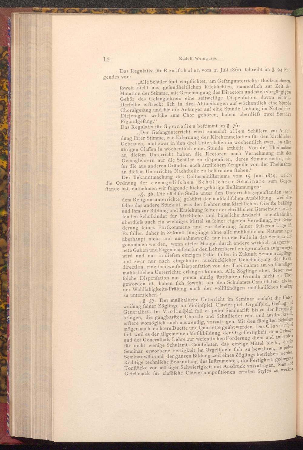 ,,§. 37. Der mufikalifche Unterricht im Seminar umfafst die Unterweifung feiner Zöglinge im Violinfpiel, Clavierfpiel, Orgelfpiel, Gefang und Generalbafs. Im Violin fpiel foll es jeder Seminarift bis zu der Fertigkeit bringen, die gangbarften Choräle und Schullieder rein und ausdrucksvoll, erftere womöglich auch auswendig, vorzutragen. Mit den fähigften Schülern mögen auch leichtere Duette und Quartette geübt werden. Das Clavierſpiel foll, weil es der allgemeinen Mufikbildung, der Orgelfertigkeit, dem Gefange und der Generalbafs- Lehre zur wefentlichen Förderung dient und aufserdem für nicht wenige Schulamts- Candidaten das einzige Mittel bleibt, die im Seminar erworbene Fertigkeit im Orgelfpiele fich zu bewahren, in jedem Seminar während der ganzen Bildungszeit eines Zöglings betrieben werden. Richtige techniſche Behandlung des Inftrumentes, die Fertigkeit, gediegene Tonftücke von mässiger Schwierigkeit mit Ausdruck vorzutragen, Sinn und Gefchmack für claffifche Claviercompofitionen ernften Styles zu wecken