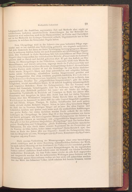 Dem Chorgefange wird in der Schweiz eine ganz befondere Pflege zugewendet und er hat dafelbft eine Verbreitung gefunden wie nirgends anderwärts. ⚫ Faft jede Gemeinde hat ihren aus freier Vereinigung hervorgegangenen Männerchor, in mehreren Städten finden wir auch Frauenchöre mit felbftftändiger Organifation. Das Verdienft in diefer Beziehung läfst fich zurückführen auf Hans Georg Nägeli( den Componiften der weltbekannten Melodie ,, Freuet euch des Lebens") geboren 1768 zu Zürich und dafelbft geftorben 1836. Er gab den Anftofs zur Einführung des Männergefanges in das Volksleben, componirte felbft viele Werke für Männerftimmen und fchrieb aufserdem, angeregt durch die Peftalozzi'fche und Pfeiffer'fche Methode im Jahre 1809 eine„ Gefangbildungs- Lehre", die noch heute in vielen Partien nicht veraltet ift und die Grundlage für eine Reihe ähnlicher Werke wurde. Nägeli's Ideen und feine patriotifchen und religiöfen Gefänge fanden rafche Verbreitung; allenthalben wurden Sängervereine gebildet und Sänger herangebildet. Der oben erwähnte graphifch- ftatiftifche Bericht über die Schweizer Gefangvereine, bearbeitet von Ignaz Heim in Zürich, dem gegenwärtigen Director des„ eidgenöffifchen Sängervereines", gibt die hieher bezüglichen, höchft intereffanten Daten. Er ift äufserft forgfältig zufammengeftellt nach folgenden Rubriken: Name des Gefangvereines, Sitz des Vereines nach Canton und Gemeinde, Gründungsjahr, Zahl der Sectionen und Mitglieder, ob der Verein eine Zeitfchrift publicirt? feit wann? wie oft? Stärke der Auflage, ökonomifche Verhältniffe in Rückficht auf Vermögen zu Ende des Jahres 1871, Einnahmen und Ausgaben im Jahre 1871. Nebft dem find bei vielen Vereinen Notizen über ihre Wirkfamkeit beigefetzt. Diefer Bericht führt an, dafs Pfarrer Weifshaupt in Appenzell im Jahre 1818 das erfte Central- Sängerfeft organifirte und dafs Zürich, Aargau, Thurgau, St. Gallen, Schaffhaufen und noch andere Städte alsbald diefem Beiſpiele folgten. Schon im Jahre 1824 berechnete Nägeli die Zahl der in Vereinen thätigen Sänger auf 20.000. Bei allen Canton- und Volksfeften ſpielten und ſpielen auch heute noch die mufikalifchen Aufführungen eine grofse Rolle; bei vielen derfelben wurden Preife ertheilt für die beften Leiftungen im Chorgefange. Im Jahre 1842 ift es den Sängervereinen von Aarau und Zürich gelungen, alle hervorragenden Männer- Gefangvereine der Schweiz zu einem grofsen Ganzen zu vereinigen: zum„ eidgenöffifchen Sängervereine". Seit 1843 gibt es bei den gröfseren Sängerfeften„ Wettgefänge" nach den beiden Kategorien: Kunftgefang und Volksgefang.„ Diefe Einführung verurfachte mancherlei Diffonanzen, die man durch immer erneute Reglemente für die Preisrichter und die Vereine zu löfen fuchte, bisher immer vergebens"( Siehe Bericht S. 230). Der Status zu Ende des Jahres 1871 war folgender: Anzahl der Gefangvereine 1593, Zahl der Mitglieder 50.000, Vermögen 239.173 Francs, Einnahmen 273.854 Francs, Ausgaben 225.204 Francs.