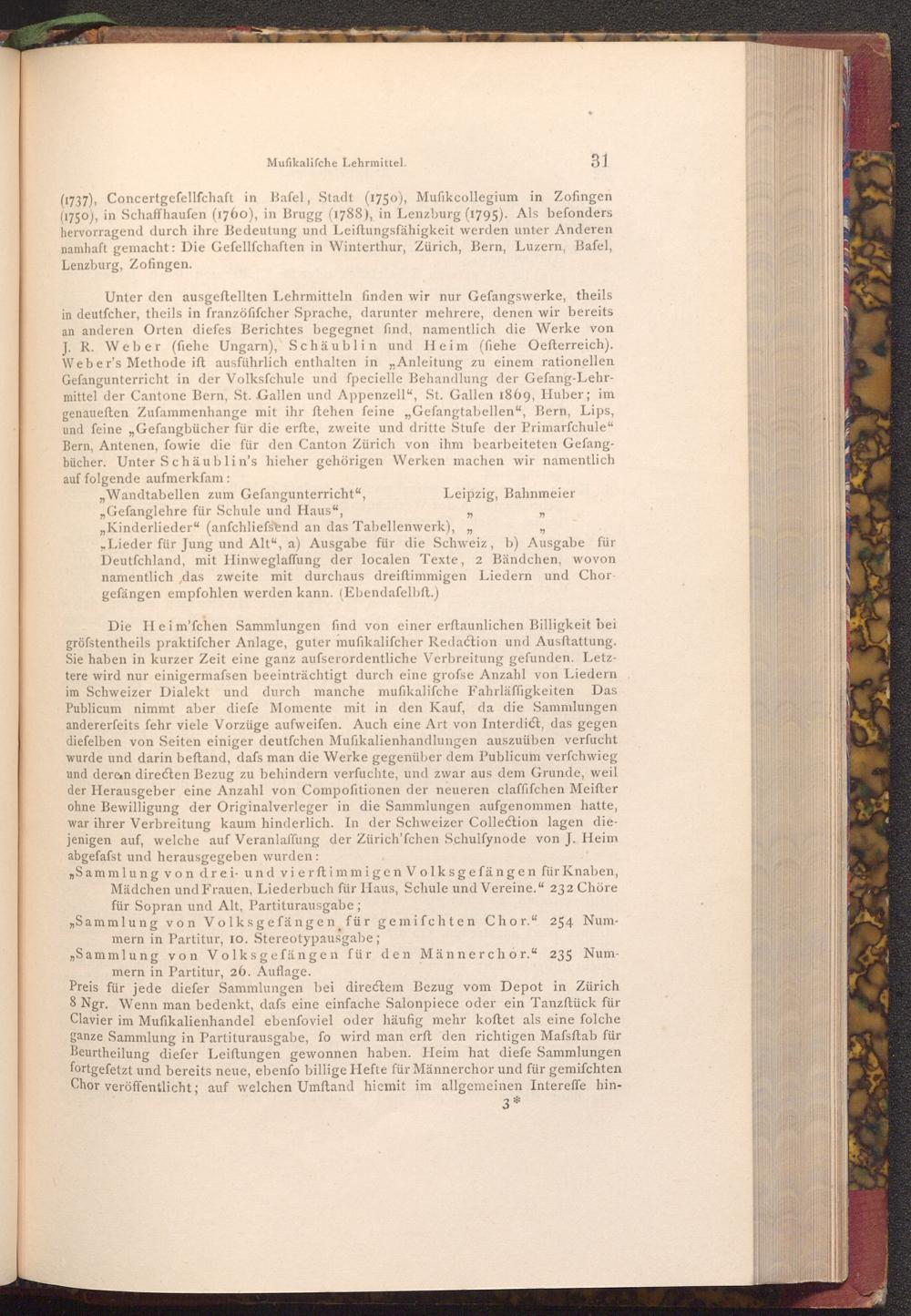 Unter den ausgeftellten Lehrmitteln finden wir nur Gefangswerke, theils in deutfcher, theils in franzöfifcher Sprache, darunter mehrere, denen wir bereits an anderen Orten diefes Berichtes begegnet find, namentlich die Werke von J. R. Weber( fiehe Ungarn), Schäublin und Heim( fiehe Oefterreich). Weber's Methode ift ausführlich enthalten in" Anleitung zu einem rationellen Gefangunterricht in der Volksfchule und fpecielle Behandlung der Gefang- Lehrmittel der Cantone Bern, St. Gallen und Appenzell", St. Gallen 1869, Huber; im genaueften Zufammenhange mit ihr ftehen feine„ Gefangtabellen", Bern, Lips, und feine„ Gefangbücher für die erfte, zweite und dritte Stufe der Primarfchule" Bern, Antenen, fowie die für den Canton Zürich von ihm bearbeiteten Gefangbücher. Unter Schäublin's hieher gehörigen Werken machen wir namentlich auf folgende aufmerkfam: