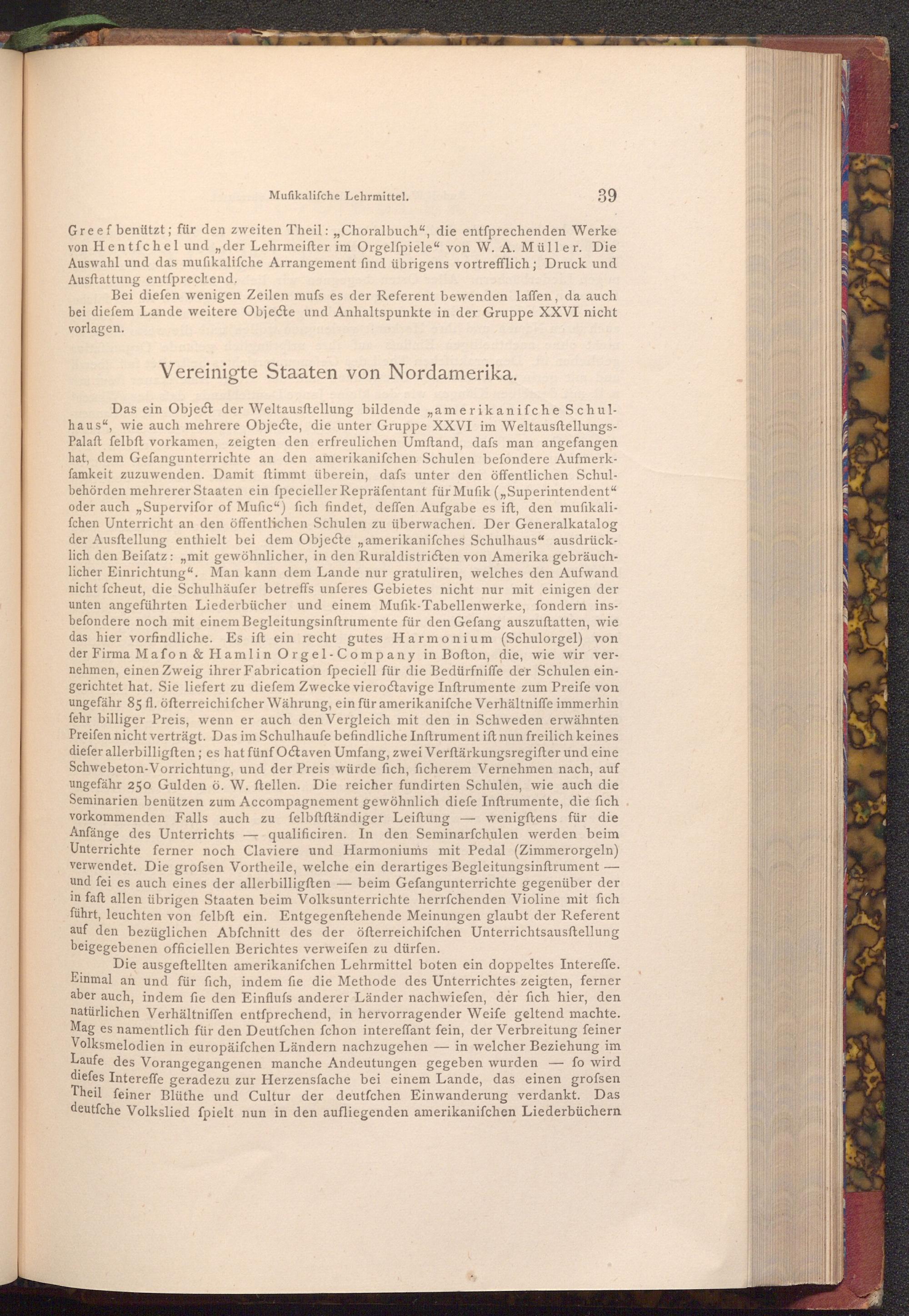 Die ausgeftellten amerikanifchen Lehrmittel boten ein doppeltes Intereffe. Einmal an und für fich, indem fie die Methode des Unterrichtes zeigten, ferner aber auch, indem fie den Einflufs anderer Länder nachwiefen, der fich hier, den natürlichen Verhältniffen entſprechend, in hervorragender Weife geltend machte. Mag es namentlich für den Deutfchen fchon intereffant fein, der Verbreitung feiner Volksmelodien in europäifchen Ländern nachzugehen in welcher Beziehung im Laufe des Vorangegangenen manche Andeutungen gegeben wurden fo wird diefes Intereffe geradezu zur Herzensfache bei einem Lande, das einen grofsen Theil feiner Blüthe und Cultur der deutfchen Einwanderung verdankt. Das deutfche Volkslied spielt nun in den aufliegenden amerikanifchen Liederbüchern