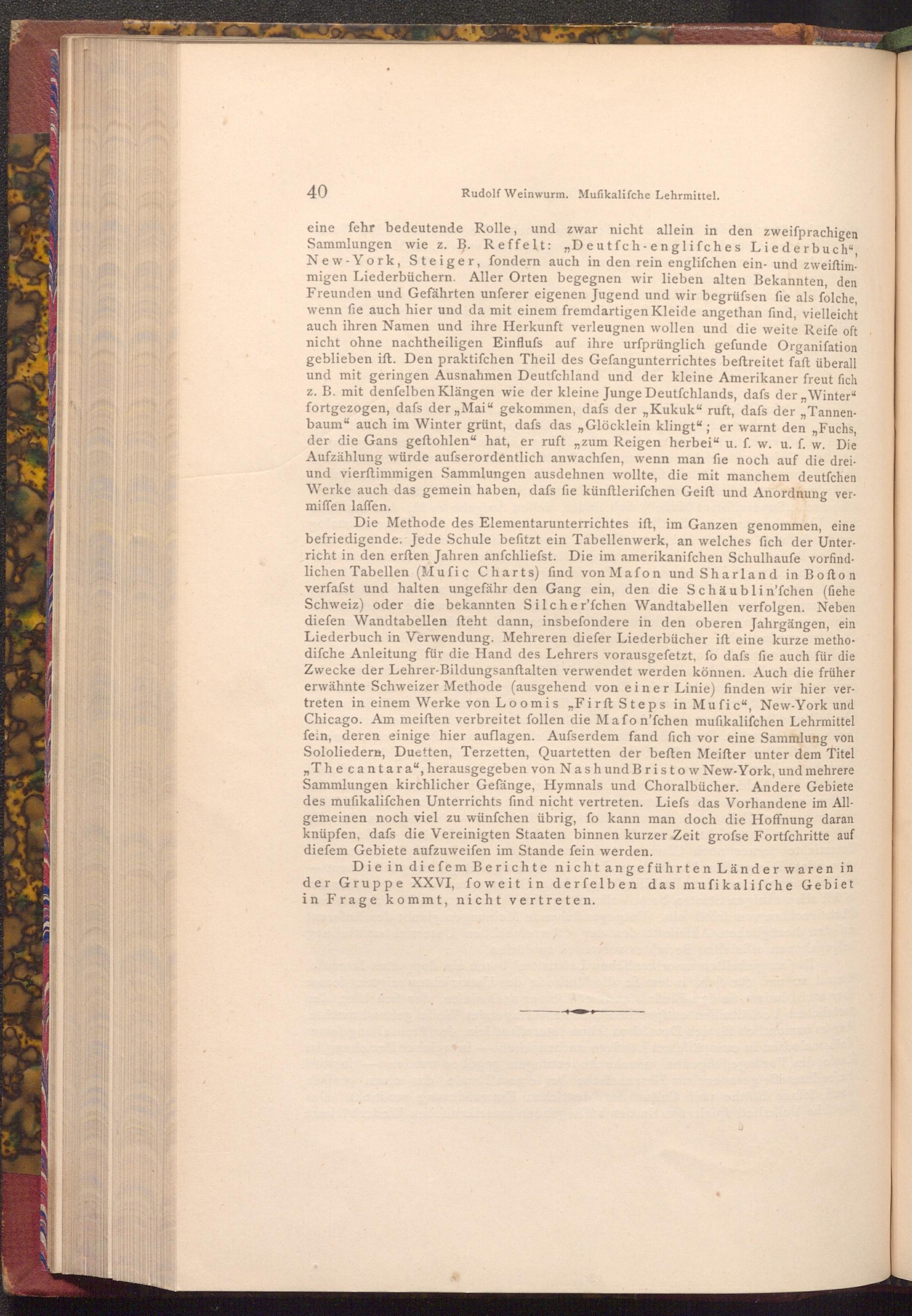 Die Methode des Elementarunterrichtes ift, im Ganzen genommen, eine befriedigende. Jede Schule befitzt ein Tabellenwerk, an welches fich der Unterricht in den erften Jahren anfchliefst. Die im amerikanifchen Schulhaufe vorfindlichen Tabellen( Mufic Charts) find von Mafon und Sharland in Bofton verfafst und halten ungefähr den Gang ein, den die Schäublin'fchen( fiehe Schweiz) oder die bekannten Silcher'fchen Wandtabellen verfolgen. Neben diefen Wandtabellen fteht dann, insbefondere in den oberen Jahrgängen, ein Liederbuch in Verwendung. Mehreren diefer Liederbücher ift eine kurze methodifche Anleitung für die Hand des Lehrers vorausgefetzt, fo dafs fie auch für die Zwecke der Lehrer- Bildungsanftalten verwendet werden können. Auch die früher erwähnte Schweizer Methode( ausgehend von einer Linie) finden wir hier vertreten in einem Werke von Loomis„ First Steps in Mufic", New- York und Chicago. Am meiften verbreitet follen die Mafon'fchen mufikalifchen Lehrmittel fein, deren einige hier auflagen. Aufserdem fand fich vor eine Sammlung von Sololiedern, Duetten, Terzetten, Quartetten der beften Meifter unter dem Titel ,, The cantara", herausgegeben von Nash und Bristow New- York, und mehrere Sammlungen kirchlicher Gefänge, Hymnals und Choralbücher. Andere Gebiete des mufikalifchen Unterrichts find nicht vertreten. Liefs das Vorhandene im Allgemeinen noch viel zu wünfchen übrig, fo kann man doch die Hoffnung daran knüpfen, dafs die Vereinigten Staaten binnen kurzer Zeit grofse Fortfchritte auf diefem Gebiete aufzuweifen im Stande fein werden.