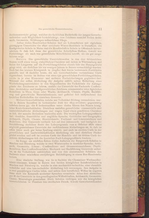 Eine ähnliche Stellung, wie fie in Sachfen die Chemnitzer Werkmeifter Schule einnimmt, kömmt in Baiern den beiden königlichen Induftriefchulen in München und Nürnberg zu, welche in eine mechanifch- techniſche, eine chemiſchtechniſche und eine bau- techniſche Abtheilung fich verzweigen, ihre Aufgabe in je zwei ganzjährigen Curfen löfen, und neben dem beruflichen Wiffen im engeren Sinne auch die Kenntnifs moderner Sprachen vermitteln. Allen drei Abtheilungen ift der Unterricht in den grundlegenden Wiffenfchaften, Arithmetik, Geometrie, Chemie, Mineralogie gemeinfam. Diefe Schulen verfolgen wie die königlichen Gewerbefchulen in Preufsen den zweifachen Zweck, fowohl Gewerbetreibenden