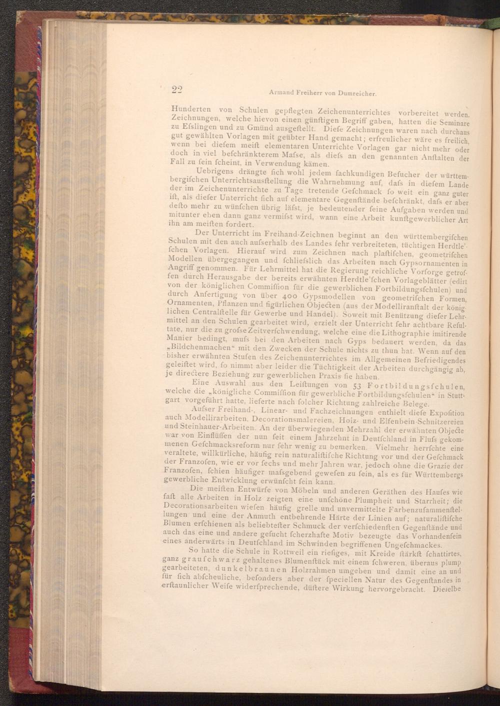 Uebrigens drängte fich wohl jedem fachkundigen Befucher der württembergifchen Unterrichtsausftellung die Wahrnehmung auf, dafs in diefem Lande der im Zeichenunterrichte zu Tage tretende Gefchmack fo weit ein ganz guter ift, als diefer Unterricht fich auf elementare Gegenftände befchränkt, dafs er aber defto mehr zu wünfchen übrig läfst, je bedeutender feine Aufgaben werden und mitunter eben dann ganz vermifst wird, wann eine Arbeit kunftgewerblicher Art ihn am meiften fordert.