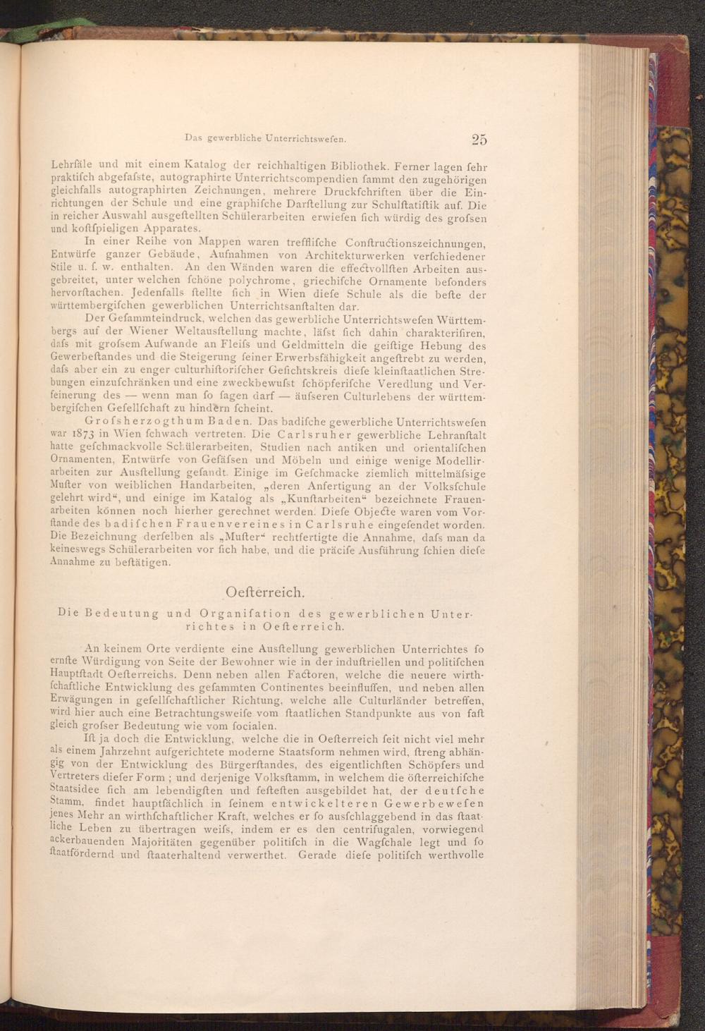 Der Gefammteindruck, welchen das gewerbliche Unterrichtswefen Württembergs auf der Wiener Weltausftellung machte, läfst fich dahin charakterifiren, dafs mit grofsem Aufwande an Fleifs und Geldmitteln die geiftige Hebung des Gewerbeftandes und die Steigerung feiner Erwerbsfähigkeit angeftrebt zu werden, dafs aber ein zu enger culturhiftorifcher Gefichtskreis diefe kleinftaatlichen Strebungen einzufchränken und eine zweckbewufst fchöpferiſche Veredlung und Verfeinerung des wenn man fo fagen darfäufseren Culturlebens der württembergifchen Gefellſchaft zu hindern fcheint.