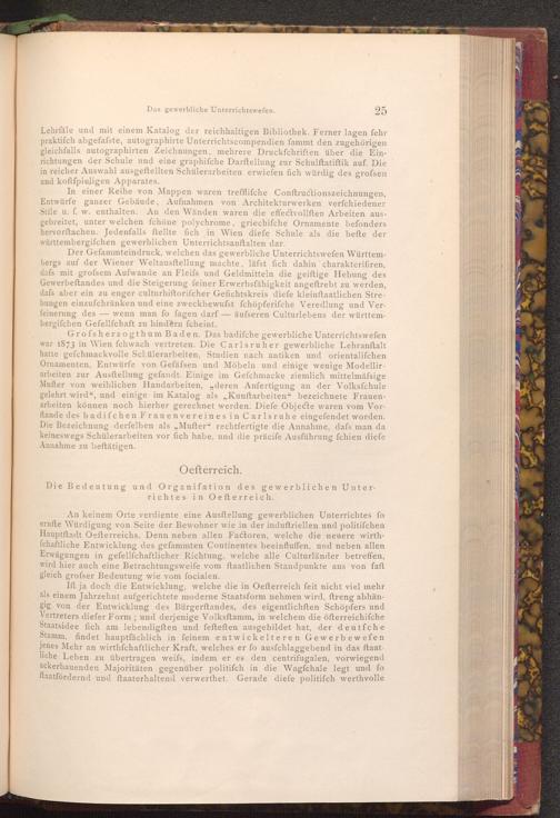 An keinem Orte verdiente eine Ausftellung gewerblichen Unterrichtes fo ernfte Würdigung von Seite der Bewohner wie in der induftriellen und politifchen Hauptftadt Oefterreichs. Denn neben allen Factoren, welche die neuere wirthfchaftliche Entwicklung des gefammten Continentes beeinfluffen, und neben allen Erwägungen in gefellfchaftlicher Richtung, welche alle Culturländer betreffen, wird hier auch eine Betrachtungsweife vom ftaatlichen Standpunkte aus von faft gleich grofser Bedeutung wie vom focialen.
