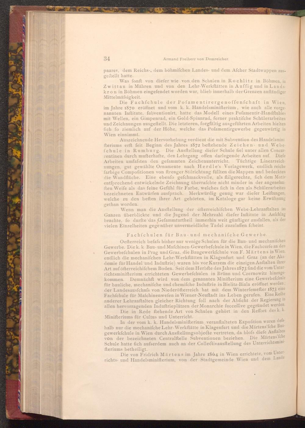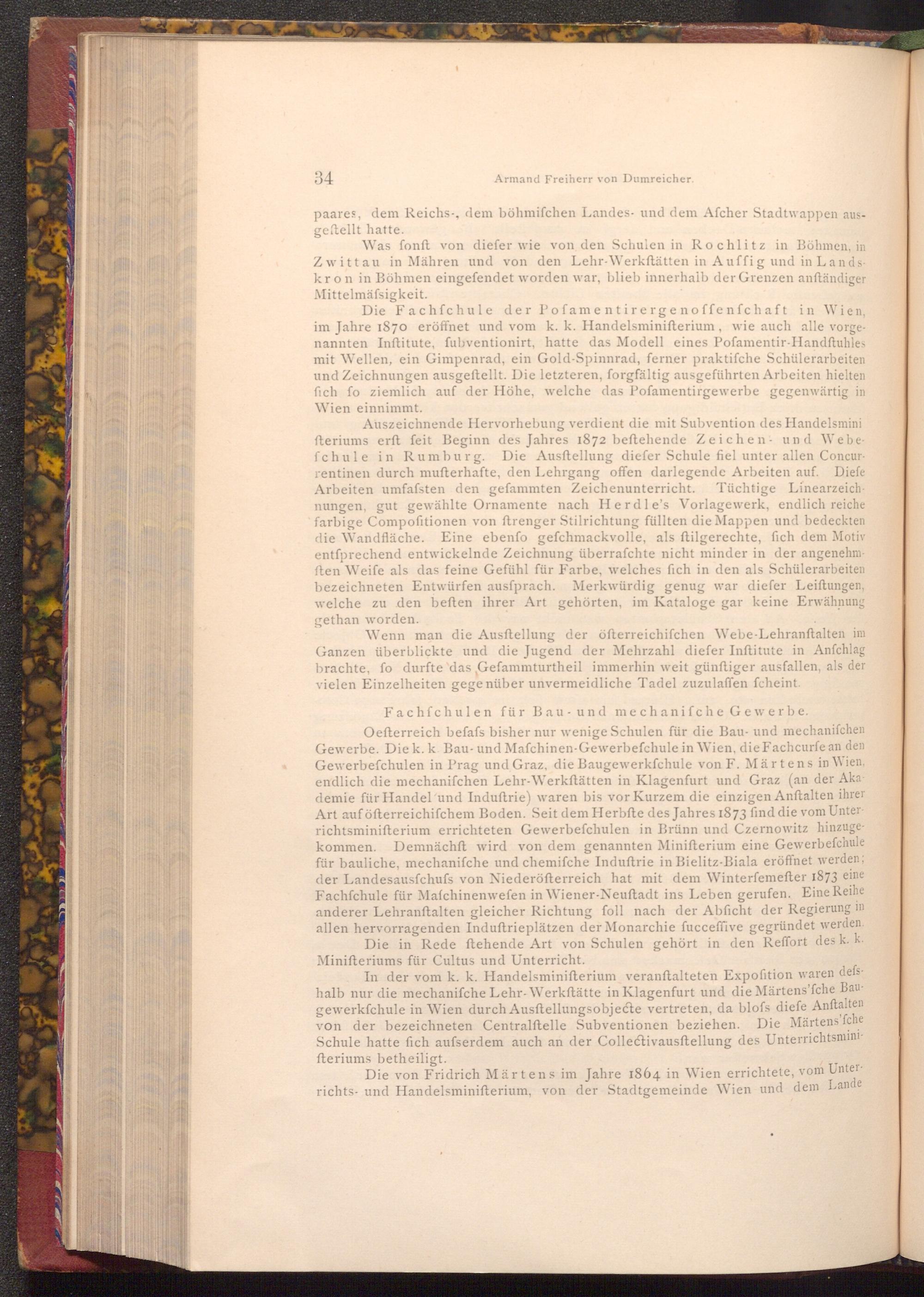 Oefterreich befafs bisher nur wenige Schulen für die Bau- und mechanifchen Gewerbe. Die k. k. Bau- und Mafchinen- Gewerbefchule in Wien, die Fachcurfe an den Gewerbefchulen in Prag und Graz, die Baugewerkfchule von F. Märtens in Wien, endlich die mechanifchen Lehr- Werkstätten in Klagenfurt und Graz( an der Aka demie für Handel und Induftrie) waren bis vor Kurzem die einzigen Anftalten ihrer Art auf öfterreichifchem Boden. Seit dem Herbfte des Jahres 1873 find die vom Unterrichtsminifterium errichteten Gewerbefchulen in Brünn und Czernowitz hinzugekommen. Demnächft wird von dem genannten Minifterium eine Gewerbefchule für bauliche, mechanifche und chemifche Induftrie in Bielitz- Biala eröffnet werden; der Landesausfchufs von Niederöfterreich hat mit dem Winterfemefter 1873 eine Fachschule für Mafchinenwefen in Wiener- Neuftadt ins Leben gerufen. Eine Reihe anderer Lehranstalten gleicher Richtung foll nach der Abficht der Regierung in allen hervorragenden Induftrieplätzen der Monarchie fucceffive gegründet werden. Die in Rede ftehende Art von Schulen gehört in den Reffort des k. k. Minifteriums für Cultus und Unterricht.