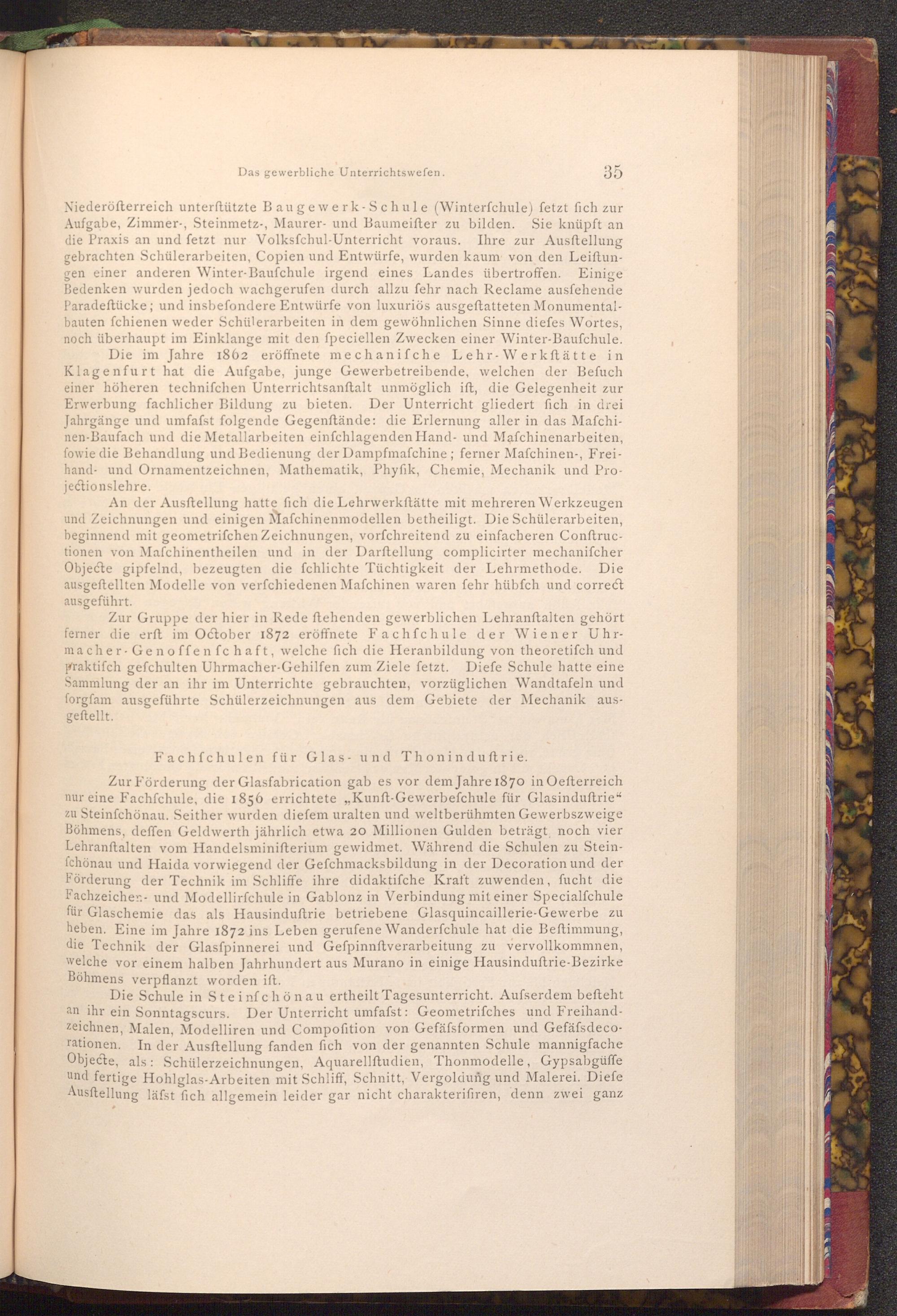 Zur Förderung der Glasfabrication gab es vor dem Jahre 1870 in Oefterreich nur eine Fachschule, die 1856 errichtete ,, Kunft- Gewerbefchule für Glasinduftrie" zu Steinfchönau. Seither wurden diefem uralten und weltberühmten Gewerbszweige Böhmens, deffen Geldwerth jährlich etwa 20 Millionen Gulden beträgt, noch vier Lehranstalten vom Handelsminifterium gewidmet. Während die Schulen zu Steinfchönau und Haida vorwiegend der Gefchmacksbildung in der Decoration und der Förderung der Technik im Schliffe ihre didaktifche Kraft zuwenden, fucht die Fachzeichen und Modellirfchule in Gablonz in Verbindung mit einer Specialfchule für Glaschemie das als Hausinduftrie betriebene Glasquincaillerie- Gewerbe zu heben. Eine im Jahre 1872 ins Leben gerufene Wanderfchule hat die Beftimmung, die Technik der Glasfpinnerei und Gefpinnftverarbeitung zu vervollkommnen, welche vor einem halben Jahrhundert aus Murano in einige Hausinduftrie- Bezirke Böhmens verpflanzt worden ift.