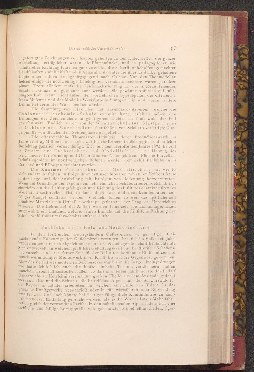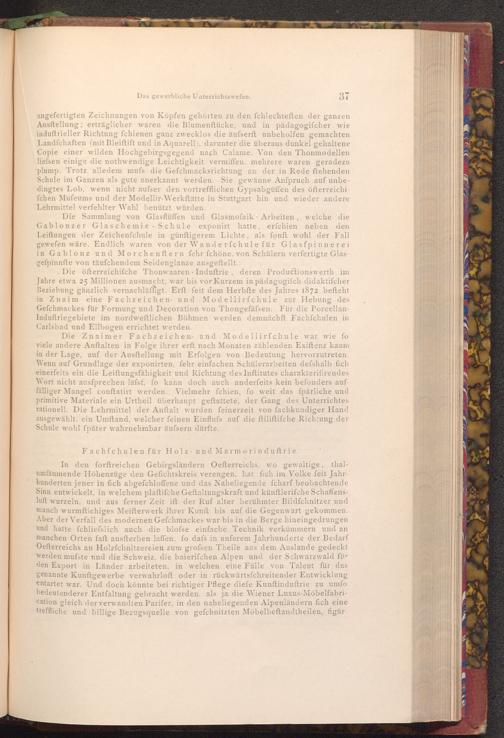 Die öfterreichifche Thonwaaren Induftrie, deren Productionswerth im Jahre etwa 25 Millionen ausmacht, war bis vor Kurzem in pädagogifch didaktifcher Beziehung gänzlich vernachläffigt. Erft feit dem Herbfte des Jahres 1872 befteht in Znaim eine Fachzeichen und Modellirfchule zur Hebung des Gefchmackes für Formung und Decoration von Thongefäfsen. Für die PorcellanInduftriegebiete im nordweftlichen Böhmen werden demnächft Fachſchulen in Carlsbad und Ellbogen errichtet werden.