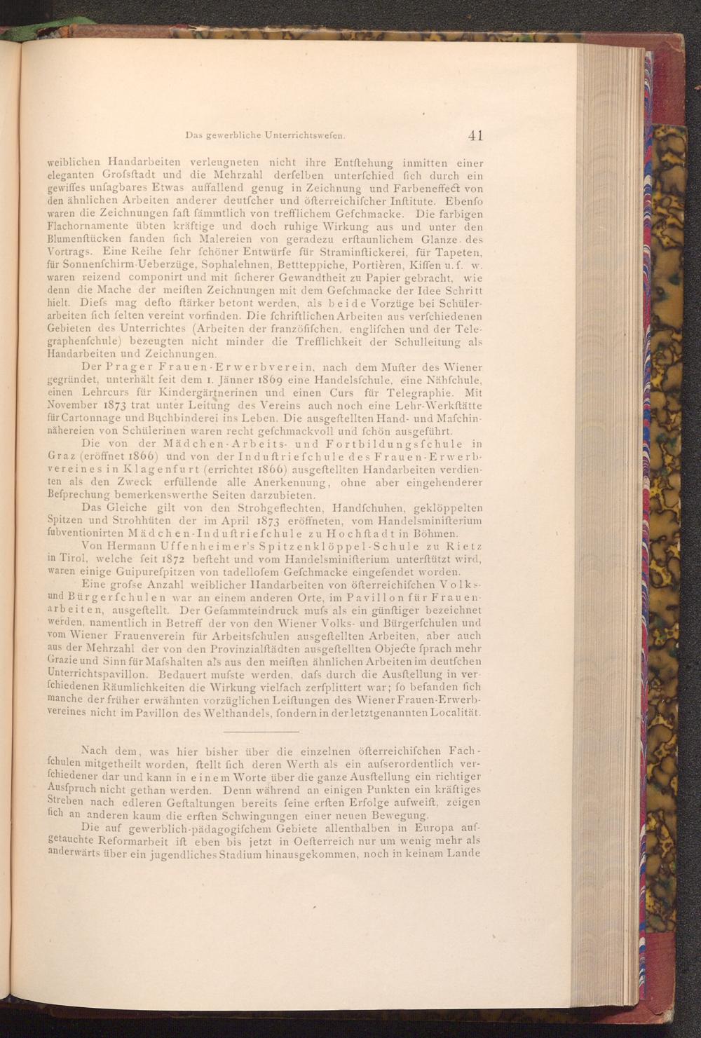 Der Prager Frauen Erwerbverein, nach dem Mufter des Wiener gegründet, unterhält feit dem 1. Jänner 1869 eine Handelsfchule, eine Nähfchule, einen Lehrcurs für Kindergärtnerinen und einen Curs für Telegraphie. Mit November 1873 trat unter Leitung des Vereins auch noch eine Lehr- Werkstätte für Cartonnage und Buchbinderei ins Leben. Die ausgeftellten Hand- und Mafchinnähereien von Schülerinen waren recht gefchmackvoll und fchön ausgeführt.