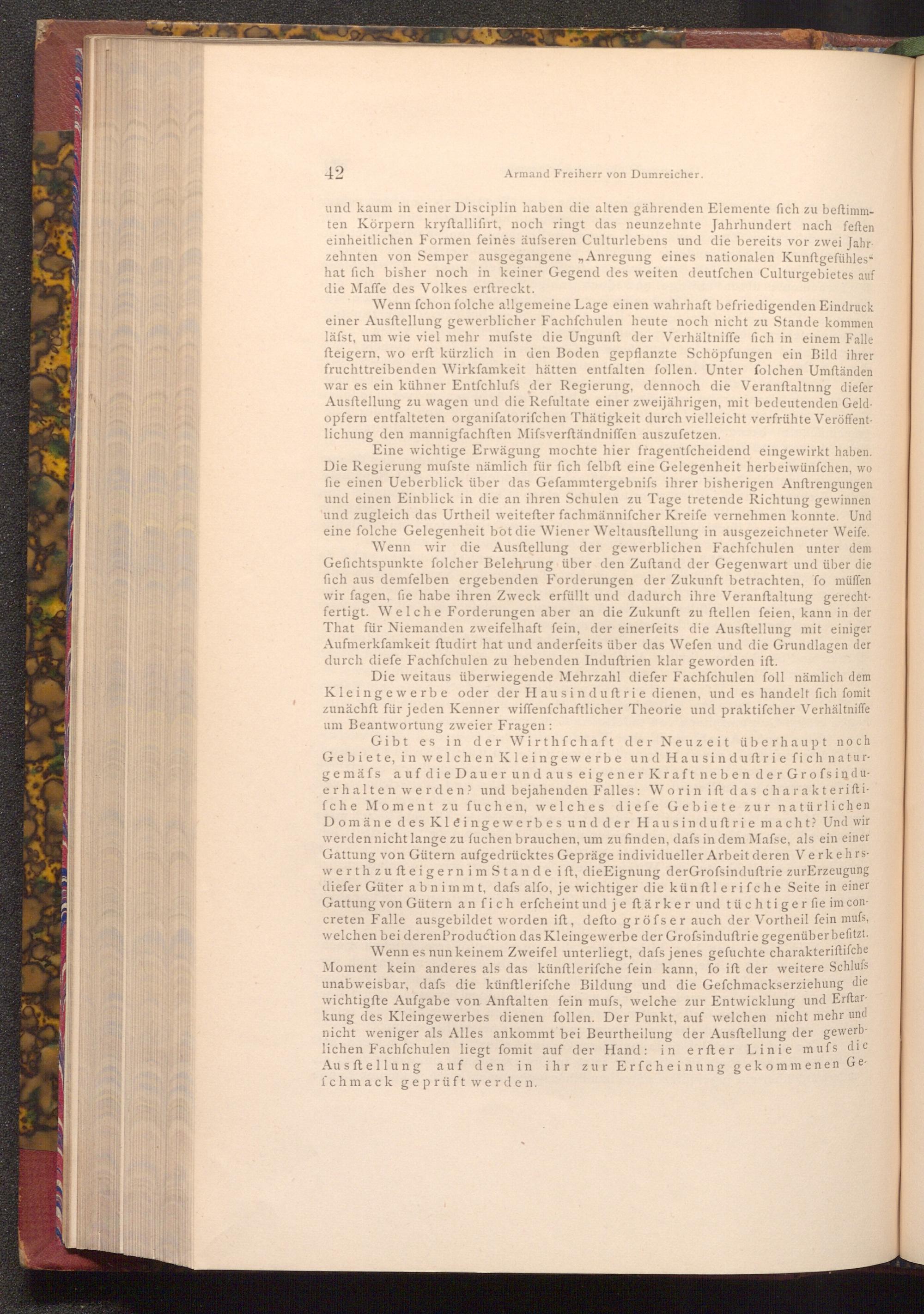 Gibt es in der Wirthfchaft der Neuzeit überhaupt noch Gebiete, in welchen Kleingewerbe und Hausinduftrie fich naturgemäfs auf die Dauer und aus eigener Kraft neben der Grofsinduerhalten werden? und bejahenden Falles: Worin ift das charakteriftifche Moment zu fuchen, welches diefe Gebiete zur natürlichen Domäne des Kleingewerbes und der Hausinduftrie macht? Und wir werden nicht lange zu fuchen brauchen, um zu finden, dafs in dem Mafse, als ein einer Gattung von Gütern aufgedrücktes Gepräge individueller Arbeit deren Verkehrswerth zufteigern im Stande ift, die Eignung der Grofsinduftrie zur Erzeugung diefer Güter abnimmt, dafs alfo, je wichtiger die künftlerifche Seite in einer Gattung von Gütern an fich erfcheint und je ftärker und tüchtiger fie im concreten Falle ausgebildet worden ift, defto gröfs er auch der Vortheil fein muss, welchen bei deren Production das Kleingewerbe der Grofsinduftrie gegenüber befitzt. Wenn es nun keinem Zweifel unterliegt, dafs jenes gefuchte charakteriftifche Moment kein anderes als das künftlerifche fein kann, fo ift der weitere Schlufs unabweisbar, dafs die künftlerifche Bildung und die Gefchmackserziehung die wichtigſte Aufgabe von Anftalten fein mufs, welche zur Entwicklung und Erftarkung des Kleingewerbes dienen follen. Der Punkt, auf welchen nicht mehr und nicht weniger als Alles ankommt bei Beurtheilung der Ausftellung der gewerblichen Fachschulen liegt fomit auf der Hand: in erster Linie mufs die Ausstellung auf den in ihr zur Erfcheinung gekommenen Gefchmack geprüft werden.