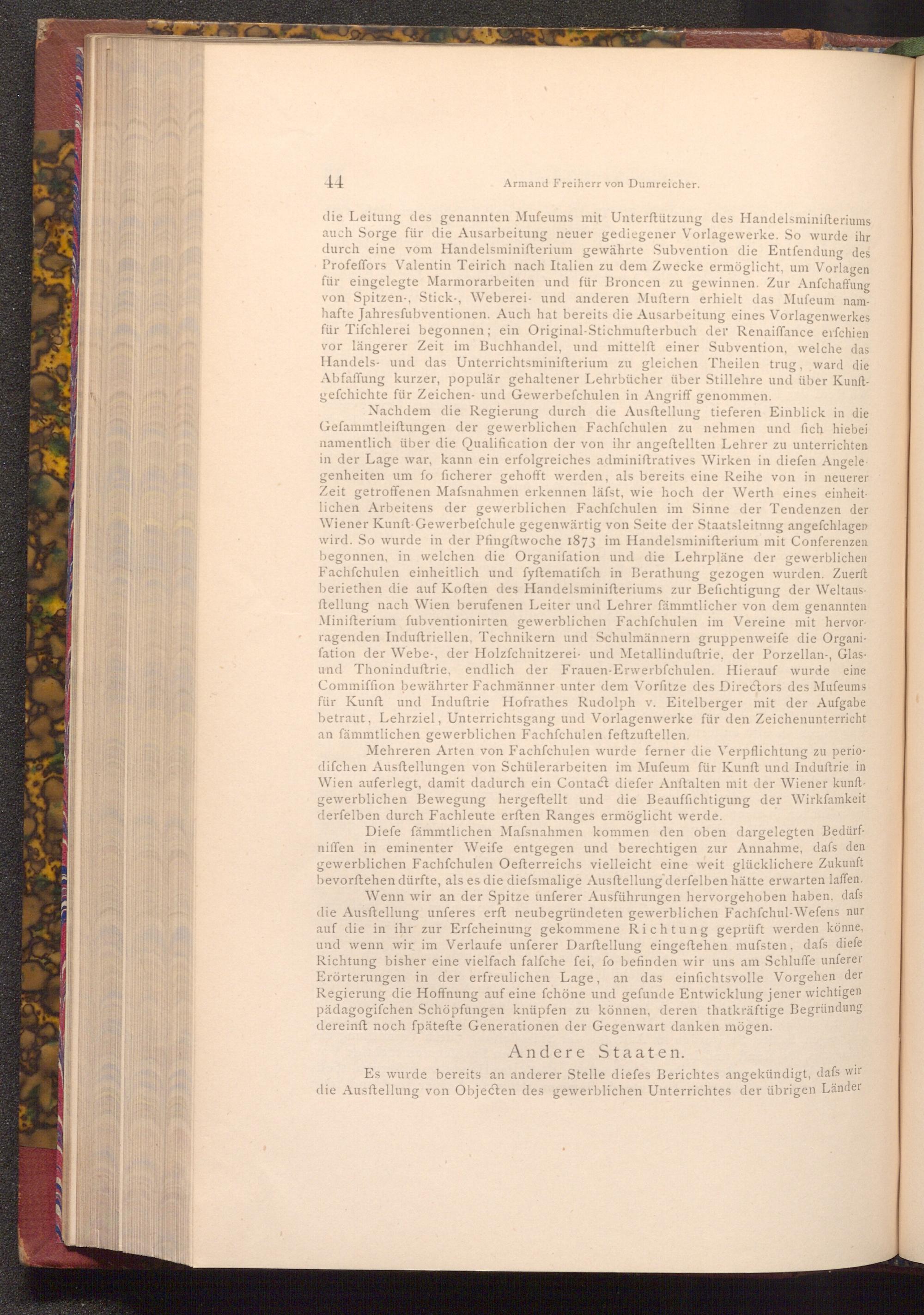 die Leitung des genannten Mufeums mit Unterſtützung des Handelsminifteriums auch Sorge für die Ausarbeitung neuer gediegener Vorlagewerke. So wurde ihr durch eine vom Handelsminifterium gewährte Subvention die Entfendung des Profeffors Valentin Teirich nach Italien zu dem Zwecke ermöglicht, um Vorlagen für eingelegte Marmorarbeiten und für Broncen zu gewinnen. Zur Anfchaffung von Spitzen-, Stick-, Weberei- und anderen Muftern erhielt das Muſeum namhafte Jahresfubventionen. Auch hat bereits die Ausarbeitung eines Vorlagenwerkes für Tifchlerei begonnen; ein Original- Stichmufterbuch der Renaiffance erfchien vor längerer Zeit im Buchhandel, und mittelft einer Subvention, welche das Handels- und das Unterrichtsminifterium zu gleichen Theilen trug, ward die Abfaffung kurzer, populär gehaltener Lehrbücher über Stillehre und über Kunftgefchichte für Zeichen- und Gewerbefchulen in Angriff genommen.