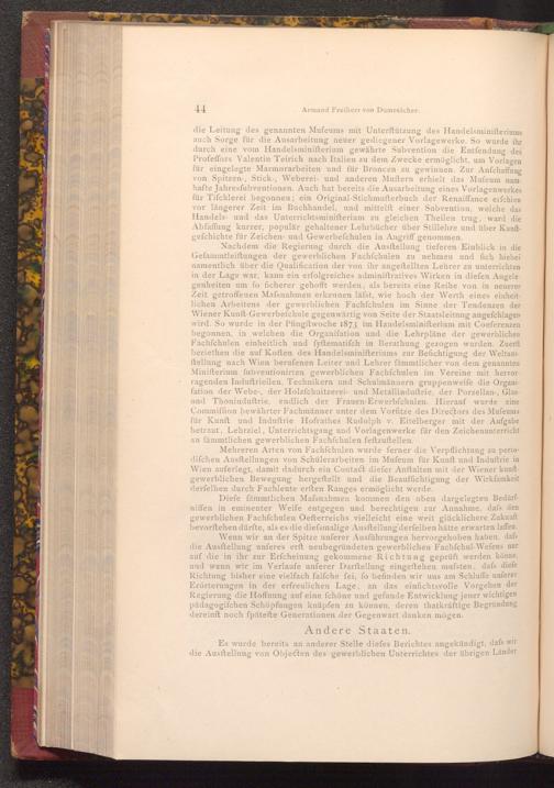 Mehreren Arten von Fachſchulen wurde ferner die Verpflichtung zu periodifchen Ausftellungen von Schülerarbeiten im Muſeum für Kunft und Induſtrie in Wien auferlegt, damit dadurch ein Contact diefer Anftalten mit der Wiener kunftgewerblichen Bewegung hergeftellt und die Beauffichtigung der Wirkfamkeit derfelben durch Fachleute erften Ranges ermöglicht werde.