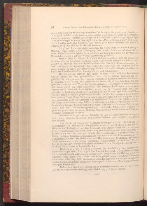 England hatte nur einige Arbeiten der Kunftſchule des South- Kenfington Muſeums eingefendet, deren Würdigung dem Kunftreferate vorbehalten bleiben mufs. Objecte aus der Sphäre des englifchen mittleren und niederen gewerblichen Unterrichtes fehlten auf der Wiener Ausftellung gänzlich.