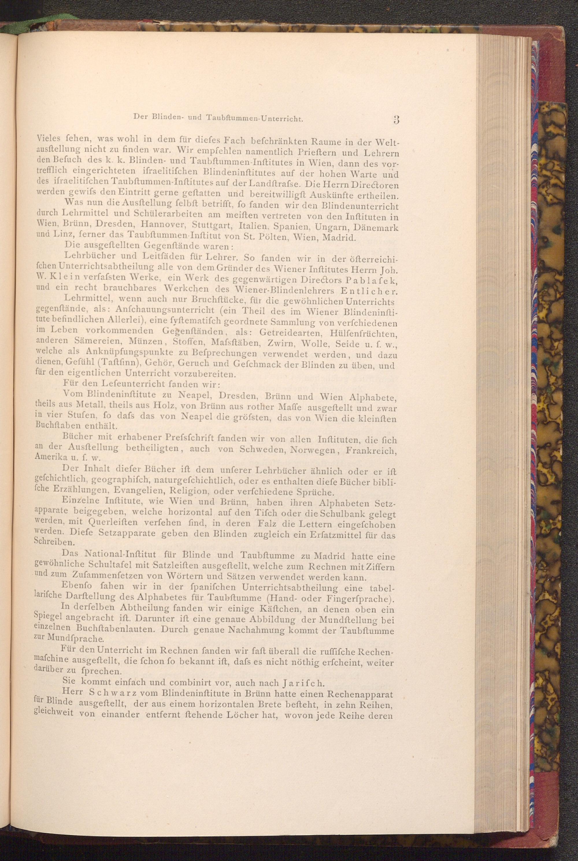 Vieles fehen, was wohl in dem für diefes Fach befchränkten Raume in der Weltausftellung nicht zu finden war. Wir empfehlen namentlich Prieſtern und Lehrern den Befuch des k. k. Blinden- und Taubftummen- Inftitutes in Wien, dann des vortrefflich eingerichteten ifraelitifchen Blindeninftitutes auf der hohen Warte und des ifraelitifchen Taubftummen- Inftitutes auf der Landftrafse. Die Herrn Directoren werden gewifs den Eintritt gerne geftatten und bereitwilligft Auskünfte ertheilen. Was nun die Ausftellung felbft betrifft, fo fanden wir den Blindenunterricht durch Lehrmittel und Schülerarbeiten am meiften vertreten von den Inftituten in Wien, Brünn, Dresden, Hannover, Stuttgart, Italien, Spanien, Ungarn, Dänemark und Linz, ferner das Taubftummen- Inftitut von St. Pölten, Wien, Madrid.