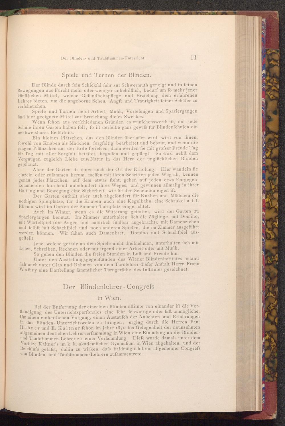 Bei der Entfernung der einzelnen Blindeninftitute von einander ift die Verftändigung des Unterrichtsperfonales eine fehr fchwierige oder faft unmögliche. Um einen einheitlichen Vorgang, einen Austaufch der Anfichten und Erfahrungen in das Blinden Unterrichtswefen zu bringen, erging durch die Herren Paul Hübner und E. Kaltner fchon im Jahre 1870 bei Gelegenheit der neunzehnten allgemeinen deutfchen Lehrerverfammlung in Wien eine Einladung an die Blindenund Taubftummen- Lehrer zu einer Verfammlung. Diefe wurde damals unter dem Vorfitze Kaltner's im k. k. akademifchen Gymnafium in Wien abgehalten, und der Befchlufs gefafst, dahin zu wirken, dafs baldmöglichft ein allgemeiner Congreſs von Blinden- und Taubftummen- Lehrern zufammentrete.