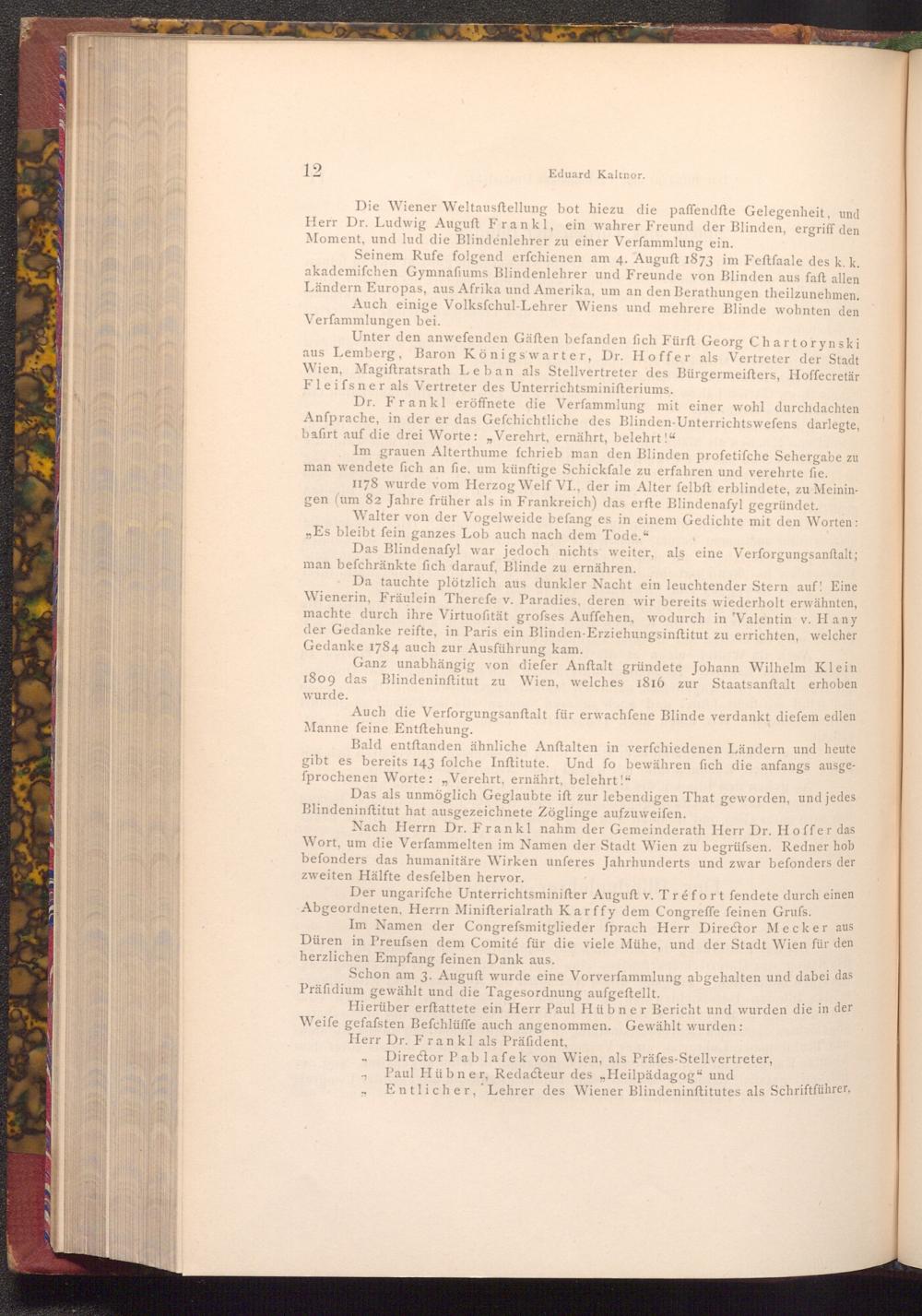 Die Wiener Weltausftellung bot hiezu die paffendfte Gelegenheit, und Herr Dr. Ludwig Auguft Frankl, ein wahrer Freund der Blinden, ergriff den Moment, und lud die Blindenlehrer zu einer Verfammlung ein.