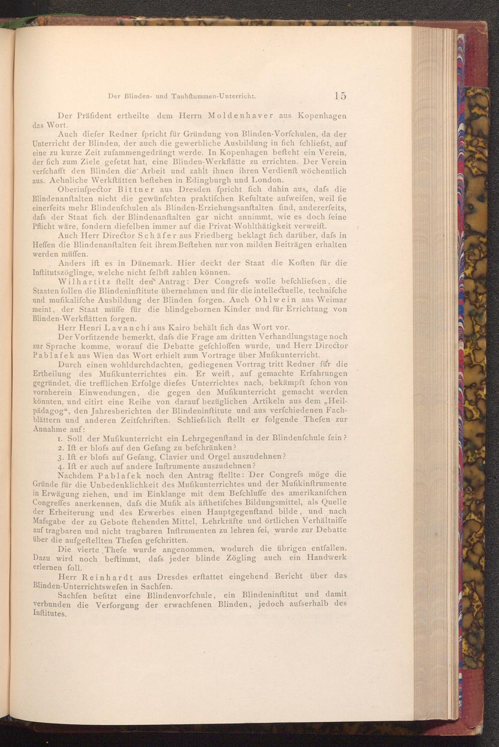Wilhartitz ftellt den Antrag: Der Congrefs wolle befchliefsen, die Staaten follen die Blindeninftitute übernehmen und für die intellectuelle, techniſche und mufikalifche Ausbildung der Blinden forgen. Auch Ohlwein aus Weimar meint, der Staat müffe für die blindgebornen Kinder und für Errichtung von Blinden- Werkflätten forgen.