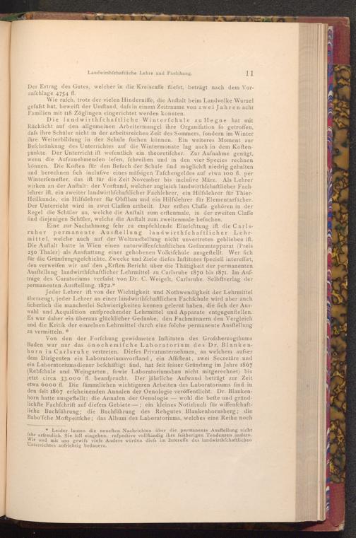 Von den der Forfchung gewidmeten Inftituten des Grofsherzogthums Baden war nur das önochemifche Laboratorium des Dr. Blankenhorn in Carlsruhe vertreten. Diefes Privatunternehmen, an welchem aufser dem Dirigenten ein Laboratoriumsvorftand, ein Affiftent, zwei Secretäre und ein Laboratoriumsdiener befchäftigt find, hat feit feiner Gründung im Jahre 1867 ( Rebfchule und Weingarten, fowie Laboratoriumsbau nicht mitgerechnet) bis jetzt circa 33.000 fl. beanfprucht. Der jährliche Aufwand beträgt zur Zeit etwa 6000 fl. Die fämmtlichen wichtigeren Arbeiten des Laboratoriums find in den feit 1867 erfcheinenden Annalen der Oenologie veröffentlicht. Dr. Blankenhorn hatte ausgeftellt: die Annalen der Oenologie wohl die befte und gründlichfte Fachfchrift auf diefem Gebiete; ein kleines Notizbuch für wiffenfchaftliche Buchführung; die Buchführung des Rebgutes Blankenhornsberg; die Babo'fche Moftpeitfche; das Album des Laboratoriums, welches eine Reihe noch