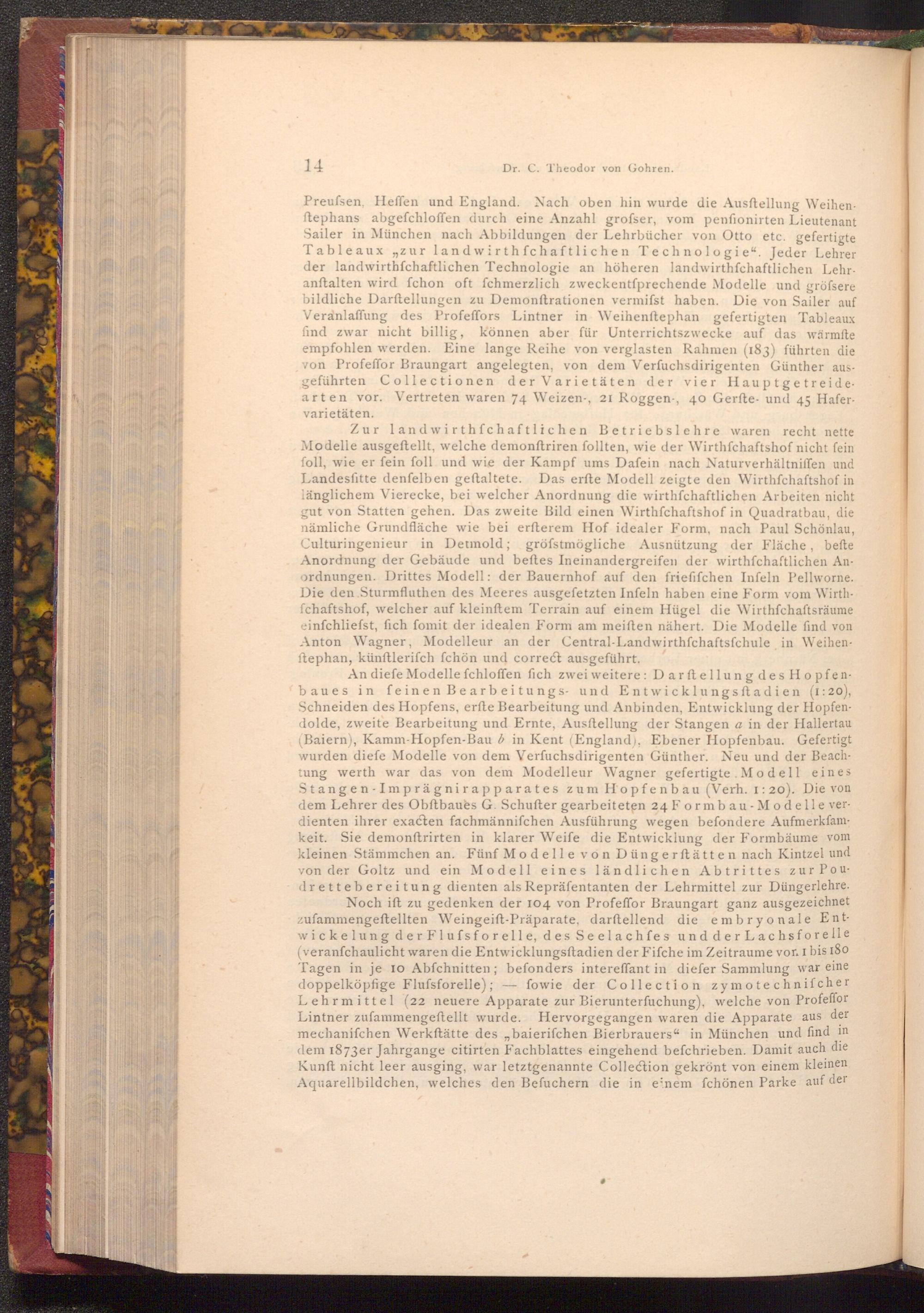 An diefe Modelle fchloffen fich zwei weitere: Darftellung des Hopfenbaues in feinen Bearbeitungs- und Entwicklungsftadien( 1:20), Schneiden des Hopfens, erfte Bearbeitung und Anbinden, Entwicklung der Hopfendolde, zweite Bearbeitung und Ernte, Ausftellung der Stangen a in der Hallertau ( Baiern), Kamm- Hopfen- Bau b in Kent( England), Ebener Hopfenbau. Gefertigt wurden diefe Modelle von dem Verfuchsdirigenten Günther. Neu und der Beachtung werth war das von dem Modelleur Wagner gefertigte Modell eines Stangen Imprägnirapparates zum Hopfenbau( Verh. 1:20). Die von dem Lehrer des Obftbauès G. Schufter gearbeiteten 24 Formbau- Modelle verdienten ihrer exacten fachmännifchen Ausführung wegen befondere Aufmerkſamkeit. Sie demonftrirten in klarer Weife die Entwicklung der Formbäume vom kleinen Stämmchen an. Fünf Modelle von Düngerftätten nach Kintzel und von der Goltz und ein Modell eines ländlichen Abtrittes zur Poudrettebereitung dienten als Repräfentanten der Lehrmittel zur Düngerlehre. Noch ift zu gedenken der 104 von Profeffor Braungart ganz ausgezeichnet zufammengeftellten Weingeift- Präparate, darftellend die embryonale Entwickelung der Flufsforelle, des Seelach fes und der Lachsforelle ( veranfchaulicht waren die Entwicklungsftadien der Fifche im Zeitraume vor. I bis 180 Tagen in je 10 Abſchnitten; befonders intereffant in diefer Sammlung war eine doppelköpfige Flufsforelle); fowie der Collection zymotechnifcher Lehrmittel( 22 neuere Apparate zur Bierunterfuchung), welche von Profeffor Lintner zufammengeftellt wurde. Hervorgegangen waren die Apparate aus der mechanifchen Werkftätte des baierifchen Bierbrauers" in München und find in dem 1873er Jahrgange citirten Fachblattes eingehend befchrieben. Damit auch die Kunft nicht leer ausging, war letztgenannte Collection gekrönt von einem kleinen Aquarellbildchen, welches den Befuchern die in einem fchönen Parke auf der