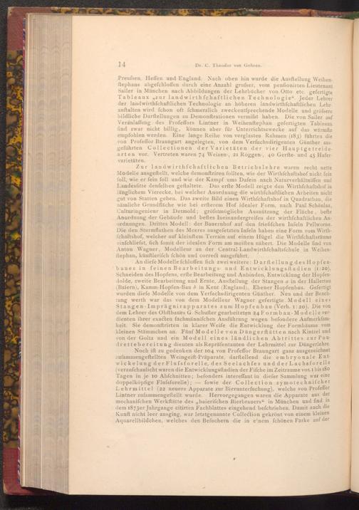 Preufsen, Heffen und England. Nach oben hin wurde die Ausftellung Weihen. ftephans abgefchloffen durch eine Anzahl grofser, vom penfionirten Lieutenant Sailer in München nach Abbildungen der Lehrbücher von Otto etc. gefertigte Tableaux zur landwirth fchaftlichen Technologie". Jeder Lehrer der landwirthschaftlichen Technologie an höheren landwirthschaftlichen Lehranftalten wird fchon oft fchmerzlich zweckentfprechende Modelle und grössere bildliche Darftellungen zu Demonftrationen vermifst haben. Die von Sailer auf Veranlaffung des Profeffors Lintner in Weihenftephan gefertigten Tableaux find zwar nicht billig, können aber für Unterrichtszwecke auf das wärmfte empfohlen werden. Eine lange Reihe von verglasten Rahmen( 183) führten die von Profeffor Braungart angelegten, von dem Verfuchsdirigenten Günther ausgeführten Collectionen der Varietäten der vier Hauptgetreide. arten vor. Vertreten waren 74 Weizen-, 21 Roggen-, 40 Gerfte- und 45 Hafervarietäten.