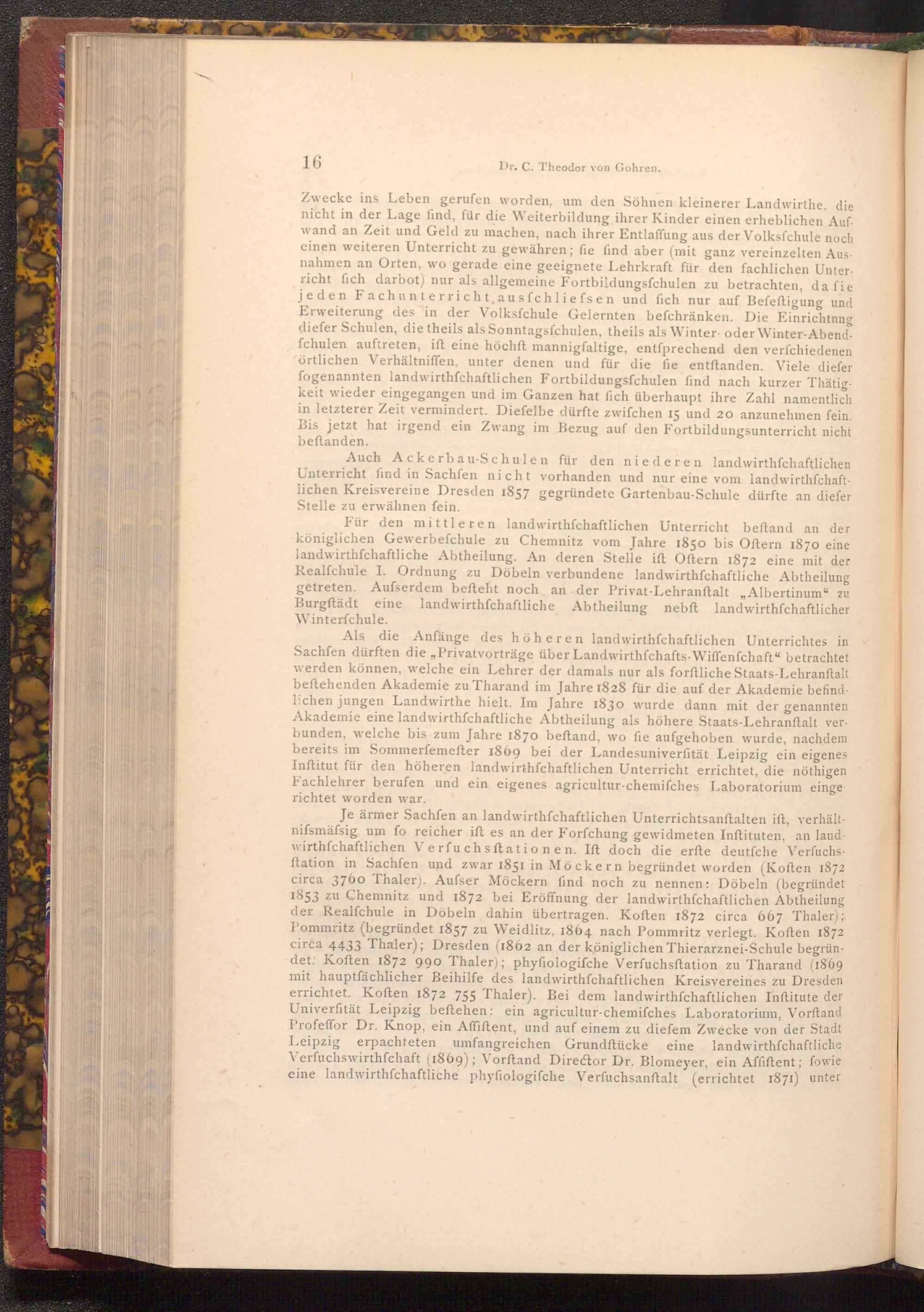 Je ärmer Sachfen an landwirthschaftlichen Unterrichtsanftalten ift, verhältnifsmässig um fo reicher ift es an der Forfchung gewidmeten Inftituten, an land. wirthfchaftlichen Verfuchsftationen. Ift doch die erfte deutfche Verfuchsftation in Sachfen und zwar 1851 in Möckern begründet worden( Koften 1872 circa 3760 Thaler). Aufser Möckern find noch zu nennen: Döbeln( begründet 1853 zu Chemnitz und 1872 bei Eröffnung der landwirthschaftlichen Abtheilung der Realfchule in Döbeln dahin übertragen. Koften 1872 circa 667 Thaler); Pommritz( begründet 1857 zu Weidlitz, 1864 nach Pommritz verlegt. Koften 1872 circa 4433 Thaler); Dresden( 1862 an der königlichen Thierarznei- Schule begründet: Koften 1872 990 Thaler); phyfiologifche Verfuchsftation zu Tharand( 1869 mit hauptfächlicher Beihilfe des landwirthfchaftlichen Kreisvereines zu Dresden errichtet. Koften 1872 755 Thaler). Bei dem landwirthschaftlichen Inftitute der Univerfität Leipzig beftehen: ein agricultur- chemifches Laboratorium, Vorftand Profeffor Dr. Knop, ein Affiftent, und auf einem zu diefem Zwecke von der Stadt Leipzig erpachteten umfangreichen Grundftücke eine landwirthfchaftliche Verfuchswirthschaft( 1869); Vorftand Director Dr. Blomeyer, ein Affiftent; fowie eine landwirthschaftliche phyfiologifche Verfuchsanftalt( errichtet 1871) unter